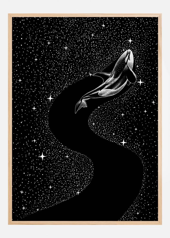 Upptäck ett universum av inspiration med vår fängslande affisch som skildrar en val som svävar majestätiskt genom ett hav av stjärnor. Denna konstfulla design kombinerar natur och kosmos i en förtrollande dans, perfekt för att ge ditt rum en känsla av under och äventyr. Med en distinkt kontrast mellan det skimrande stjärnhimlen och den mystiska valen, kommer denna print att bli en omedelbar samtalsstartare i alla miljöer.