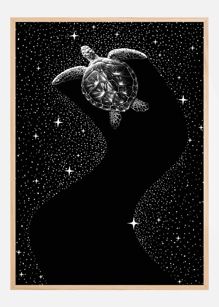 Upptäck den hypnotiska skönheten i havets djup med vår eleganta poster som framställer en ståtlig sköldpadda simmande mot en stjärnprydd bakgrund. Denna print förmedlar en känsla av ro och mysterium, perfekt för att skapa en avslappnande atmosfär i vilket rum som helst. Motivet är präglat av en kontrastrik komposition med sköldpaddan detaljerat illustrerad i vitt mot en sammetslen svart bakgrund, punkterad med små vita stjärnor som ger en illusion av ett stjärnklart universum.