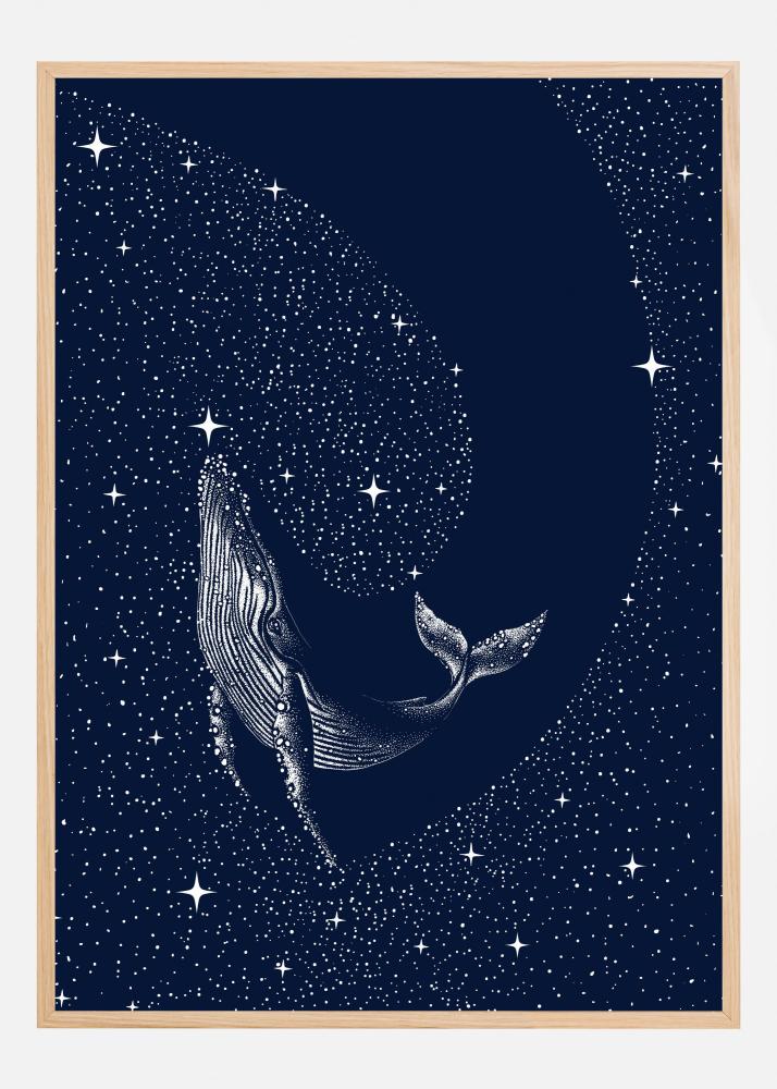 Upptäck en värld av mystik och skönhet med vår stjärnklara affisch som framkallar känslan av en stillsam natt. Denna iögonfallande print föreställer en majestätisk val som simmar genom en hav av stjärnor, inbäddad i en sällsamt lugnande kosmisk spiral. Den djupblå bakgrunden smyckad med små ljuspunkter skapar ett drömlikt och fantasifullt motiv som passar perfekt för alla som älskar naturens underverk och det oändliga universumet.