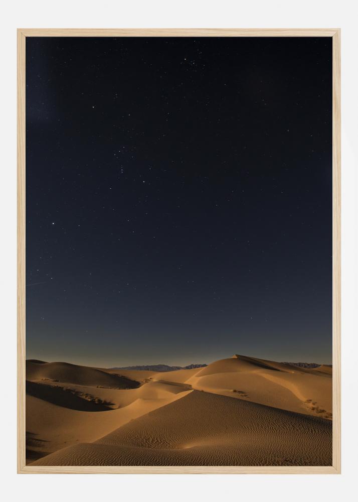 En suggestiv poster med öknen på natten. Mjuka guldgula sanddyner breder ut sig i fjärran längst ner i bilden. Ovanför sanden sträcker sig en enorm mörkblå himmel med mjuka stjärnor som är utspridda över den. Skapa en känsla av rymd när du hänger upp den här affischen hemma.
