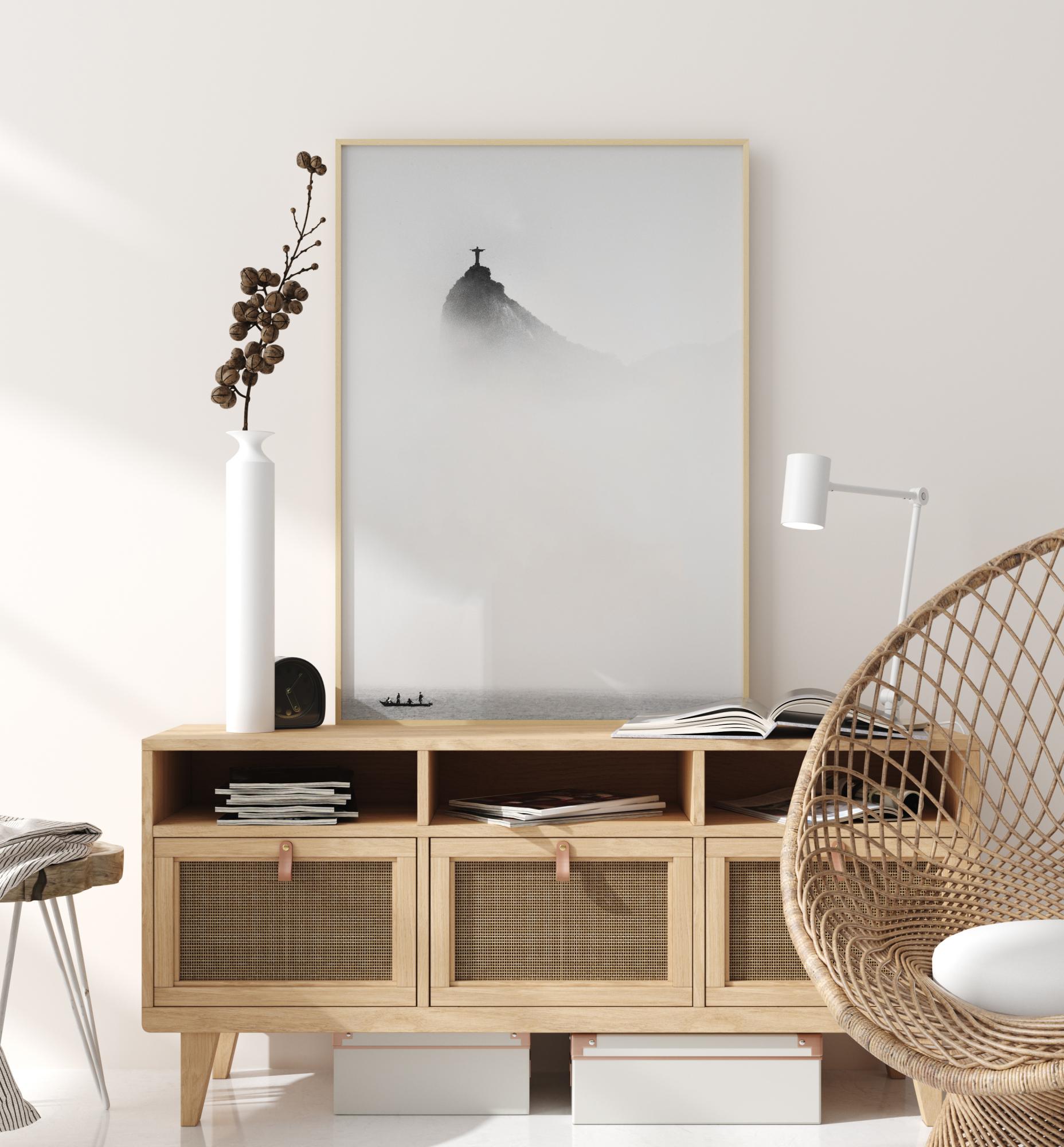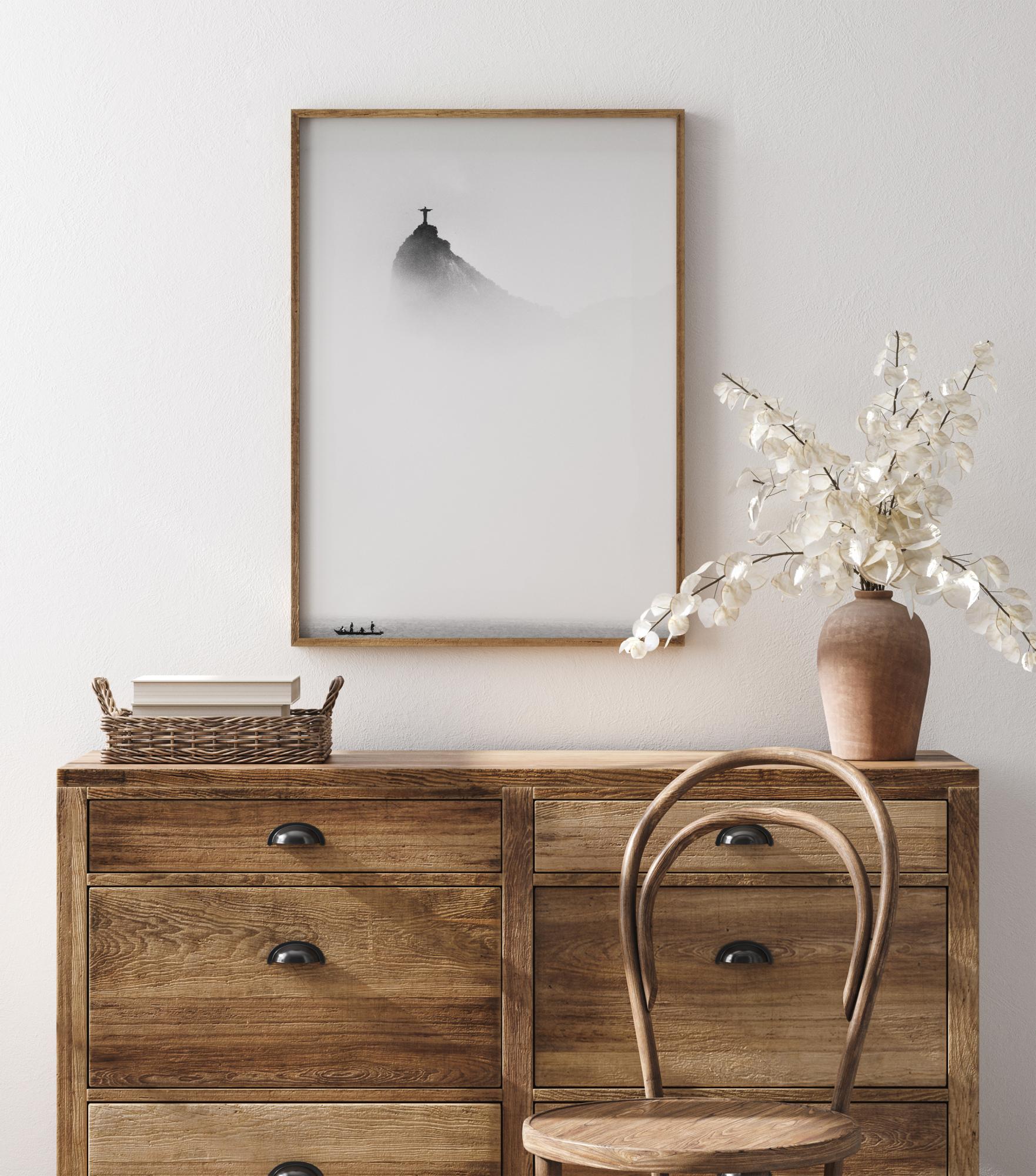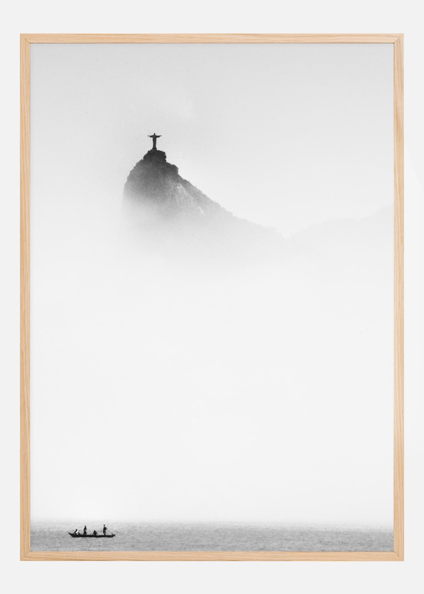 En religiös poster med Jesusstatyn på toppen av en hög klippa. En andlig känsla omger denna bild medan en liten båt flyter långt under den höga punkten. Vit dimma fyller bilden och låter korset stiga upp ur molnen på ett triumferande sätt.