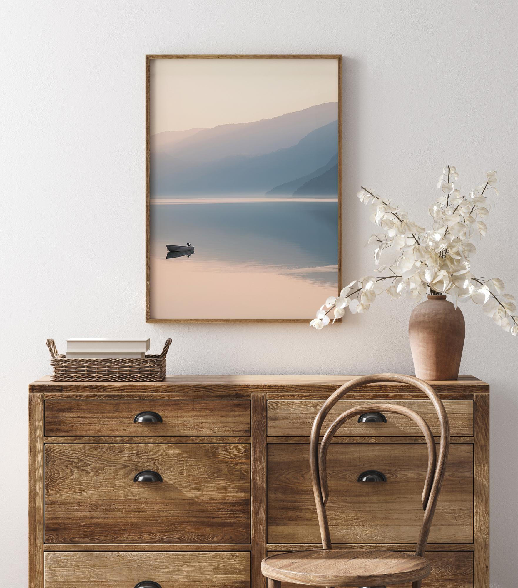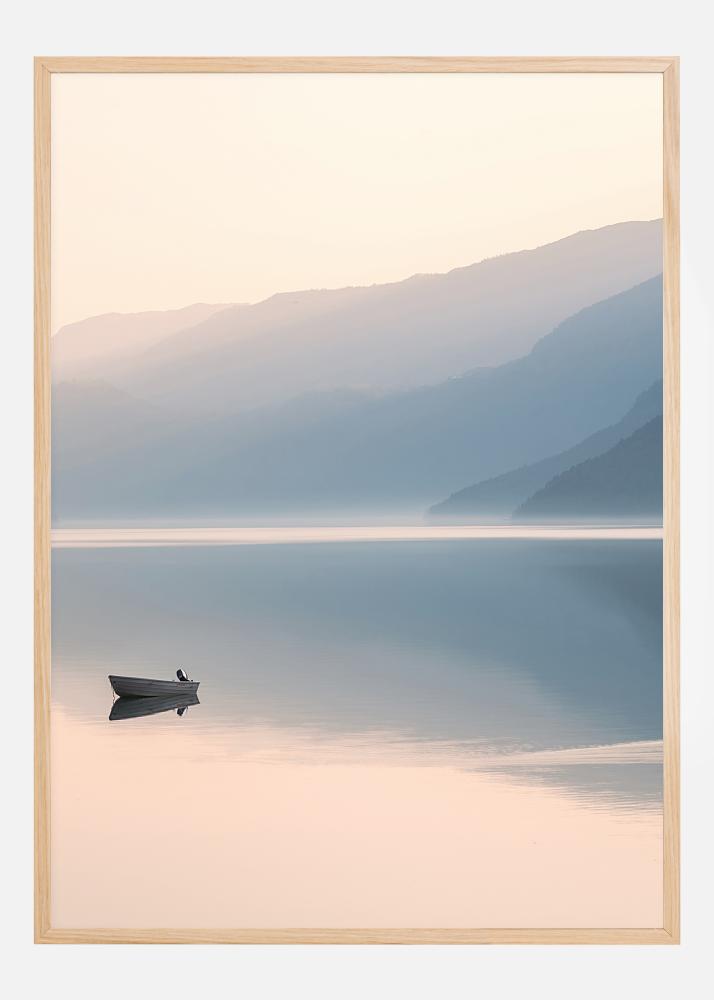 En fridfull poster med en båt mitt i en stor sjö. Denna kvällsbild är inget annat än lugn. En stilla sjö reflekterar pastellblått från bergen bakom för att skapa en tystnad och vila som kommer att genomsyra även ditt hem.
