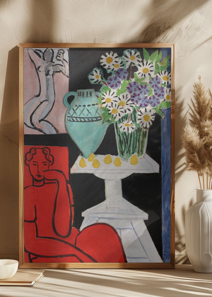 Denna affisch fångar en levande och konstnärlig scen som kombinerar både stil och elegans. Motivet visar en stiliserad figur i klarrött, vilket skapar en stark kontrast mot bakgrundens mer dämpade toner. I förgrunden ser vi ett bord med en vacker vas full av blommor, vilket ger verket en touch av naturlig skönhet och livfullhet. Vasen har en turkos nyans, medan blommorna är en mix av vita, lila och gröna toner, vilket kompletterar den övergripande färgpaletten på ett harmoniskt sätt.