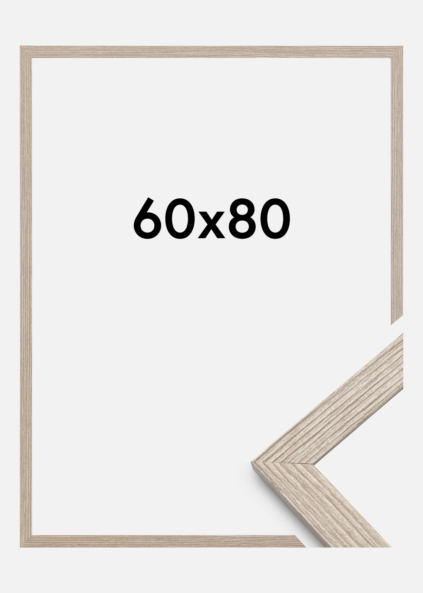 Det här är en stilfull kvalitetsram tillverkad i furu med riktigt glas. Denna snygga ram har en greige oak nyans som ger ditt motiv en trendig inramning. Stilren Greige Oak finns i flera olika storlekar så att du snyggt kan matcha flera tillsammans, just denna passar foton i 60x80 cm. Detta är en tavelram som du kan hänga upp både i stående och liggande format med dess tillhörande väggfäste. Ramlisten mäter 20 mm djup och 14 mm djup.