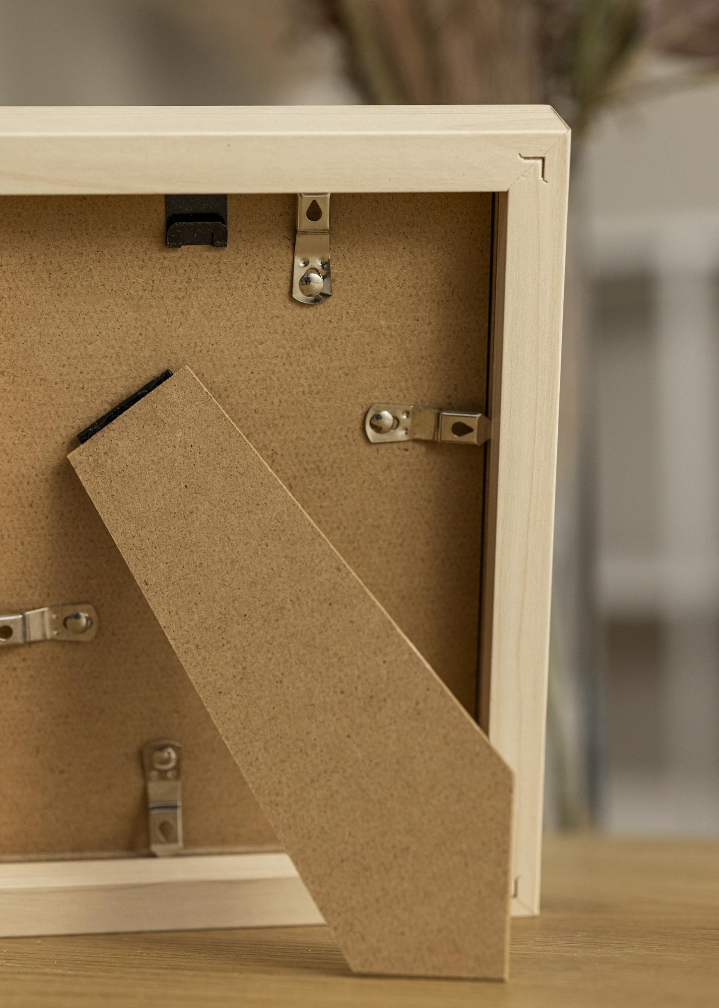 Tavelramens list är hela 30 mm djup, vilket ger en effektfull inramning. Bakstycket hålls på plats av vridbara metallclips, med vilka du kan lossa bakplattan för att montera in både bild och passepartout. På baksidan av ramen finns väggfästen för montering i stående och liggande läge.