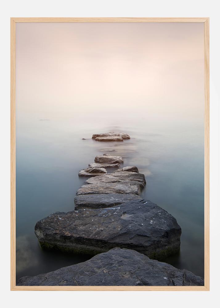 En eterisk poster med stenar som leder över en sjö in i det okända. Stora stenar leder bort till en dimmig värld bortom. Mjuka blå och rosa färger fyller den här bilden med en mjuk magisk touch. Ta det första steget och se vart dina fötter tar dig.