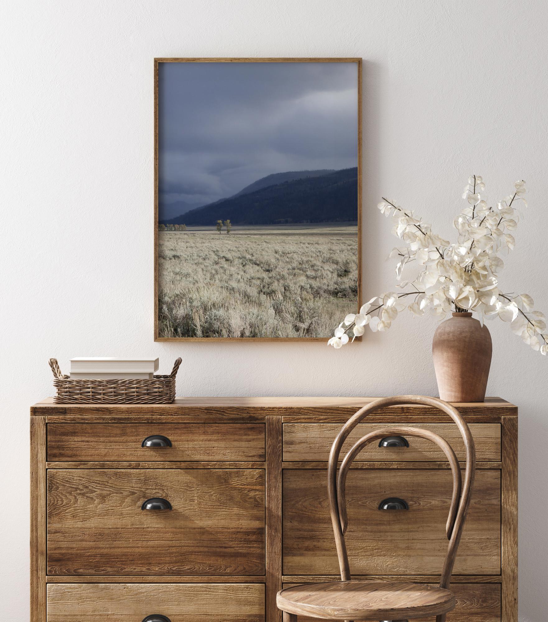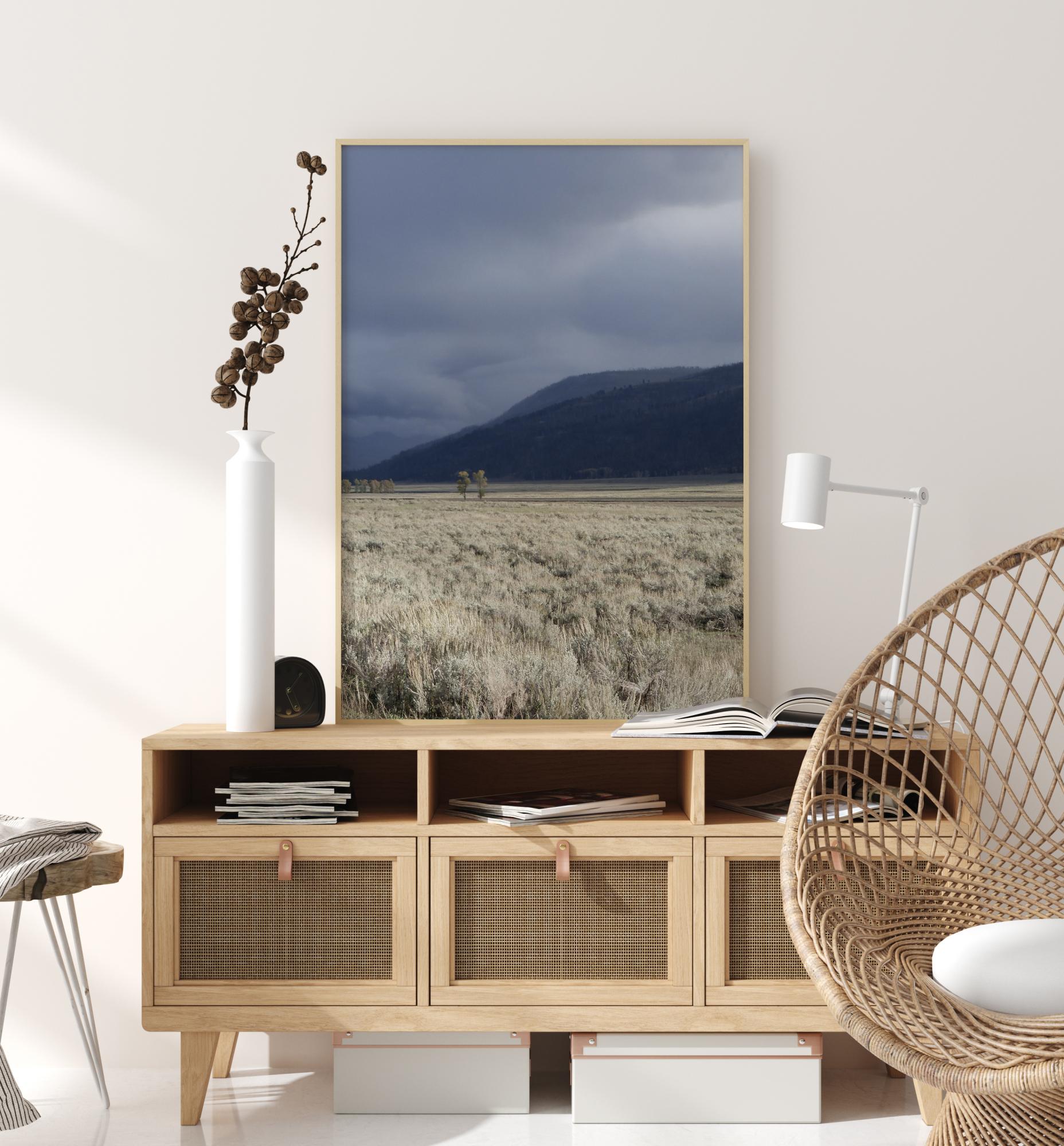 En olycksbådande poster med en förestående storm över ett vitt gräsfält. Mörka moln samlas i fjärran över blåa berg. Det vita fältet lyser klart mot de inkommande mörka molnen som snart kommer att slå till. Trycket byggs upp medan molnen rullar in i den här dramatiska scenen.