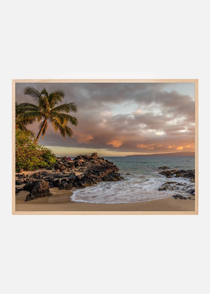 En strand i solnedgången, en vacker klyscha som är ett måste för tikinörden eller det tropiska temat. Poster med den klassiska palmen som lutar ut över strandkanten i dagens sista gyllene solstrålar. Fotografiet blir fin i en tavelram med ett väderbitet utseende eller i en stark färg för att matcha tikiinredningen.