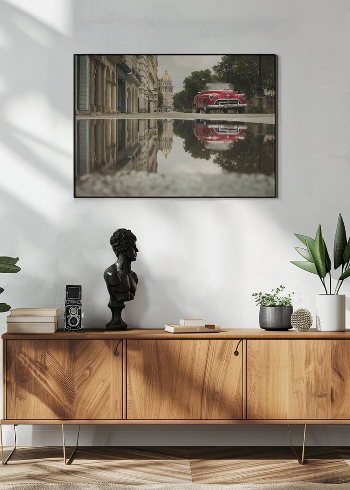 Denna poster fångar essensen av nostalgi och äventyr med en klassisk röd bil som står parkerad längs en historisk stadsgata. Bilen speglas vackert i en vattenpöl, vilket ger bilden extra djup och en tidlös känsla. Denna affisch är perfekt för dig som älskar retroinspirerade motiv och tidlös elegans.