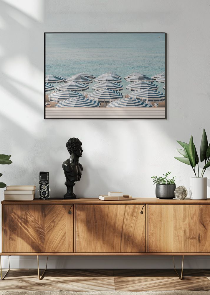Färgpaletten i detta print domineras av mjuka blå och vita nyanser som skapar en lugn och harmonisk atmosfär. Det kristallklara blå vattnet kontrasterar vackert mot de randiga svartvita parasollerna, vilket ger affischen en fräsch och inbjudande look. Perfekt för att addera en maritim touch till vilket rum som helst.