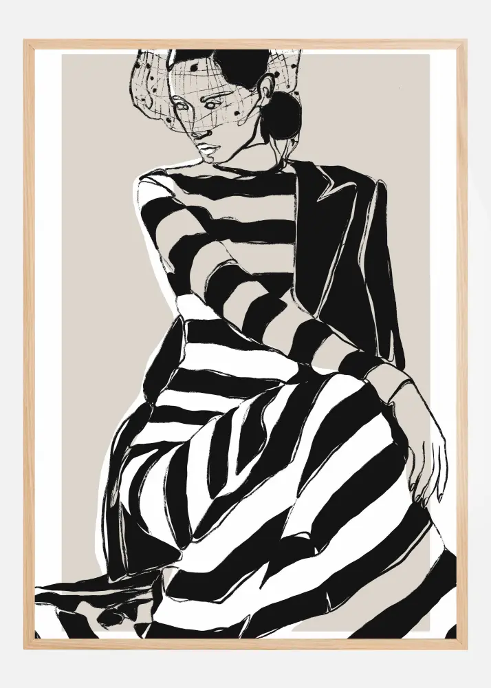 Denna stilfulla poster av en sittande figur omfamnar elegans och modern konst i en tidlös komposition. Motivet presenterar en abstrakt person i profil som sitter, draperad i klädsel med djärva, svartvita ränder som fångar betraktarens blick. Det grafiska uttrycket och det dynamiska mönstret skapar en stark visuell närvaro, perfekt för den trendmedvetna inredaren. Det begränsade färgschemat med huvudsakligen svart, vitt och nyanser av beigetoner gör denna print mycket mångsidig, och den kan enkelt matchas med diverse inredningsstilar.