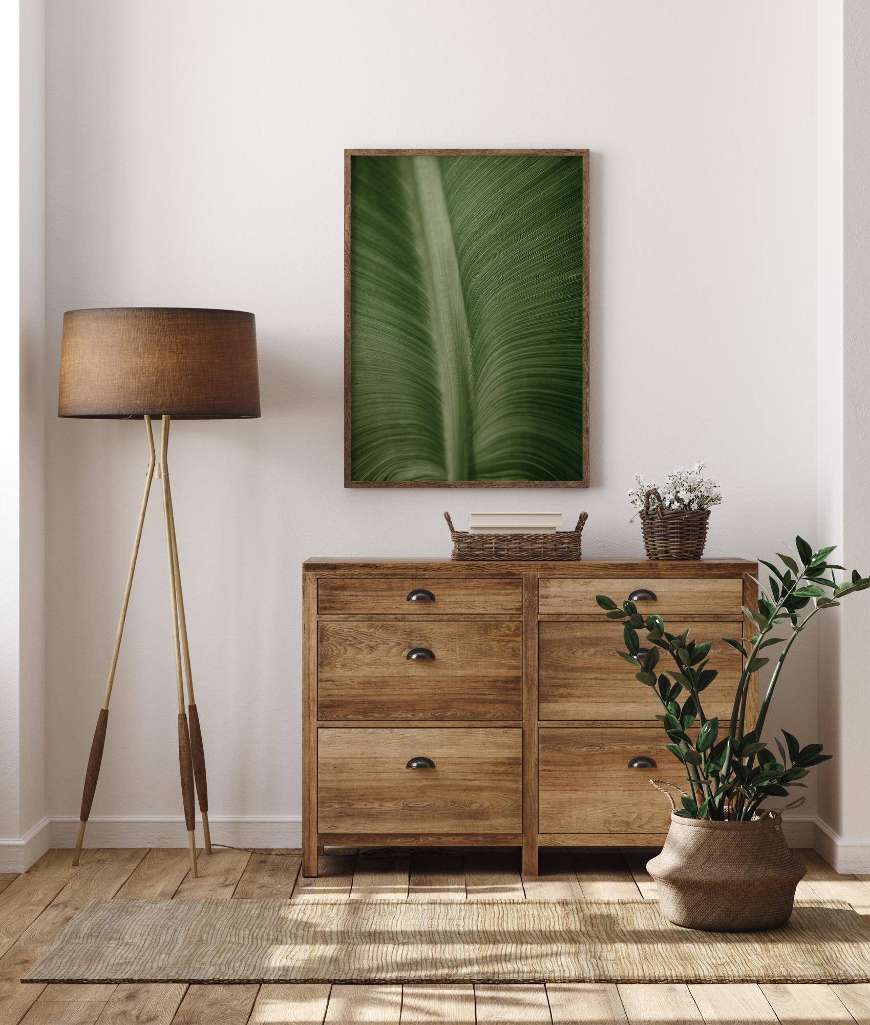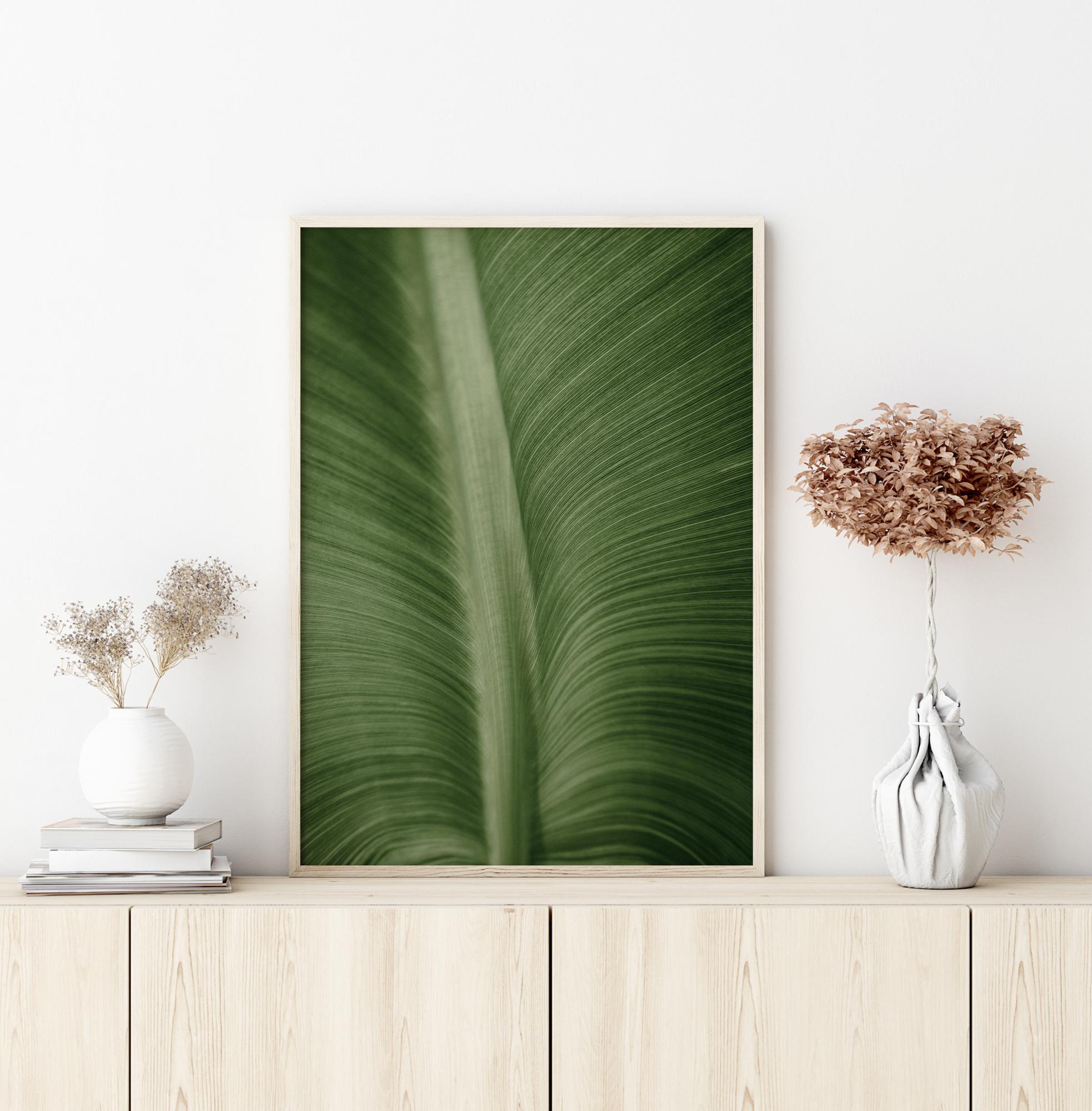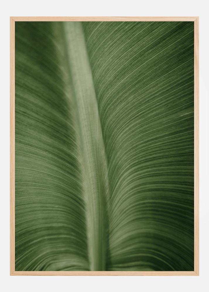 En makroposter med ett blad som visar strukturen på ådrorna och stjälken. Vackra gröna färger fyller bilden för att ge en mycket lugnande effekt. Tunna ådror kröker sig försiktigt utåt från bladets tjocka och starka mittenådra. Fördjupa dig i naturen med denna närbild.