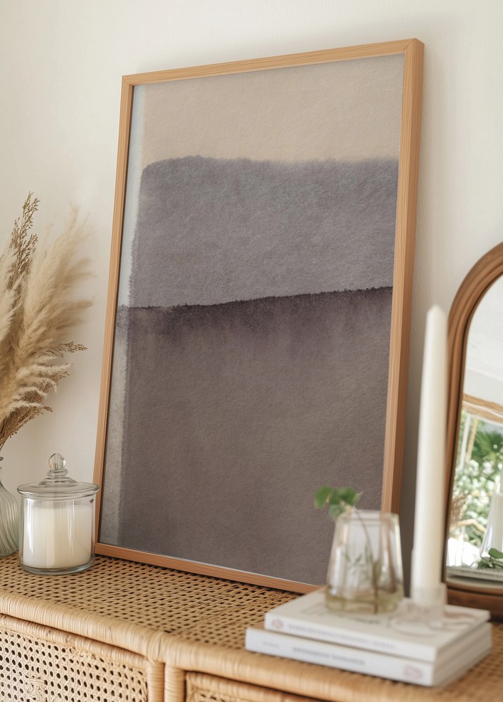 Denna poster erbjuder en subtil och harmonisk komposition som passar in i moderna och minimalistiska interiörer. Bilden består av mjuka övergångar mellan grå och beige toner, vilket skapar en lugn och sofistikerad atmosfär. De dova färgerna ger affischen en känsla av elegans och tidlöshet, vilket gör den till ett perfekt val för alla rum där man önskar ro och balans.