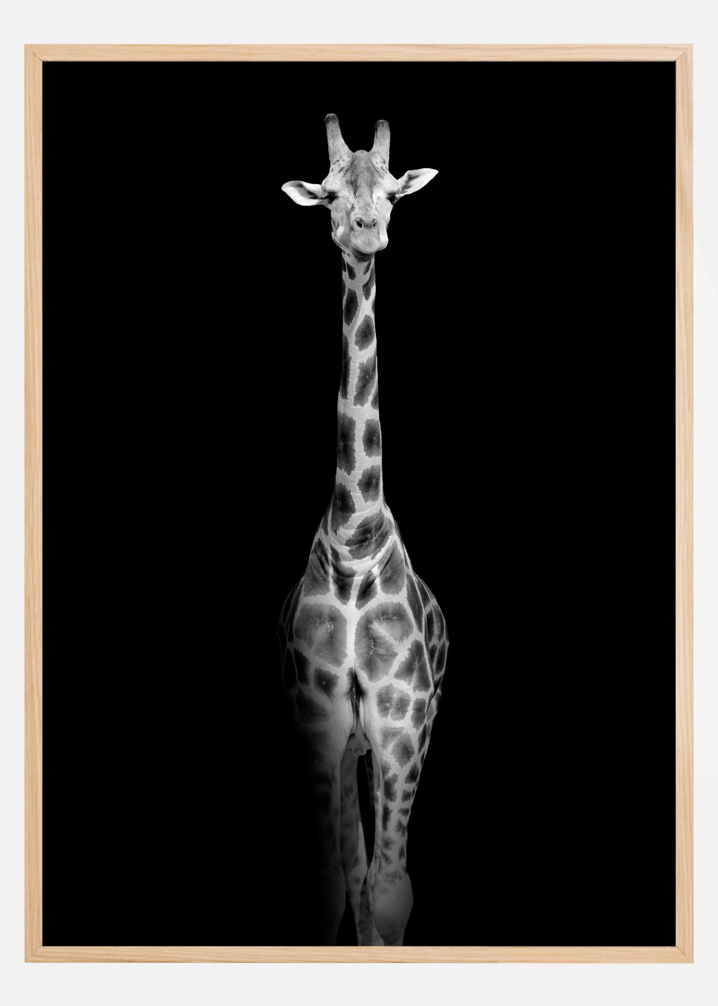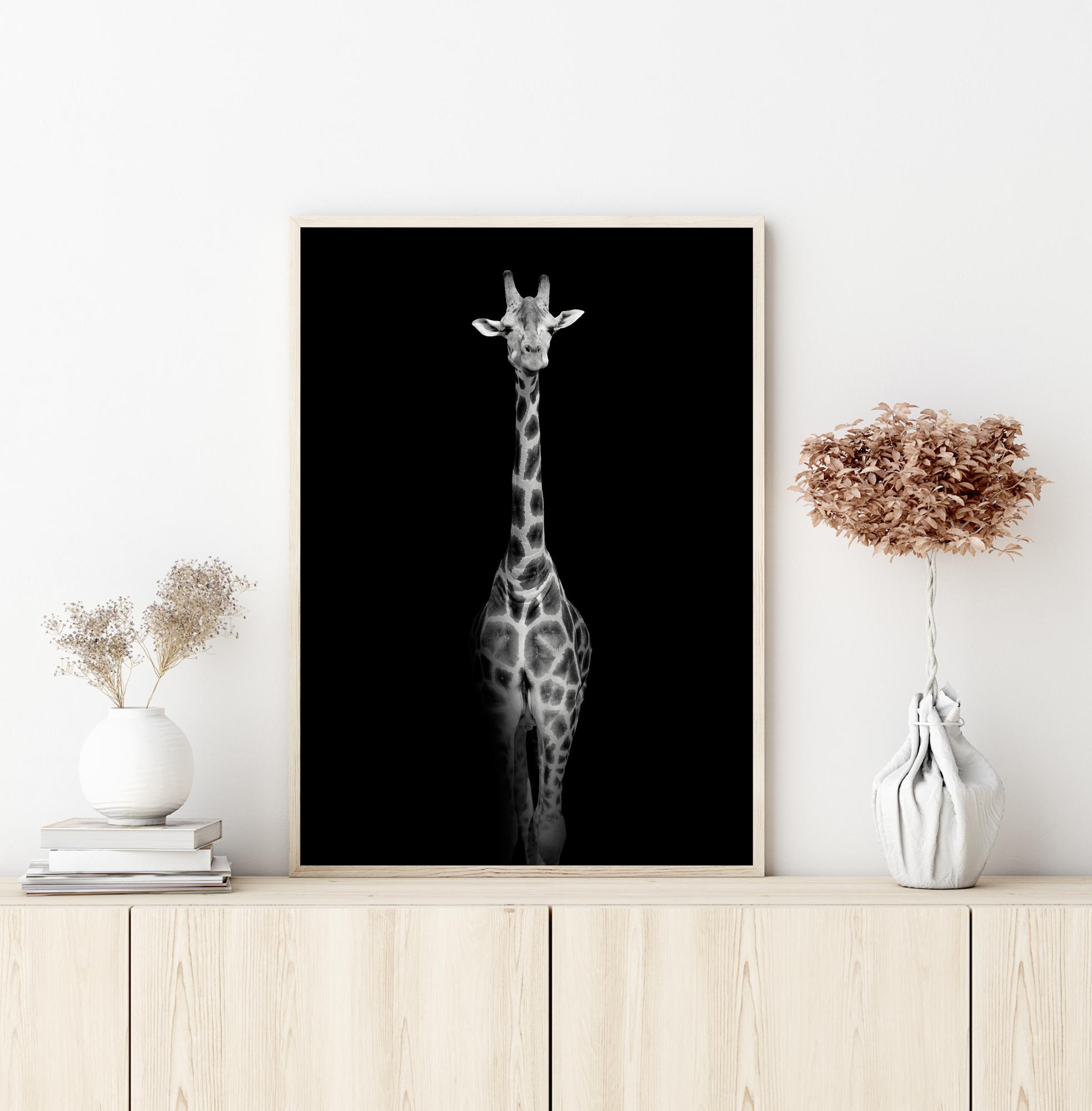 Fotografisk konst i svartvitt av en reslig giraff som kliver ut ifrån bildens svarta bakgrund. En stilren och kontrastfylld poster med ett härligt djup. Matcha gärna med andra av våra fina djurposters i samma stil för en tavelvägg i samma tema.