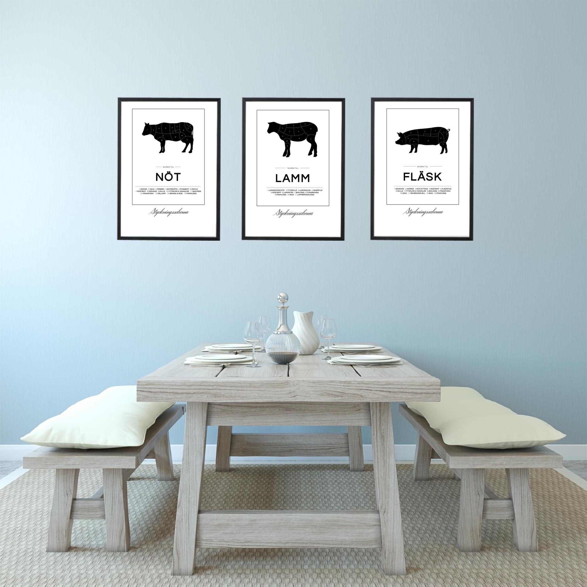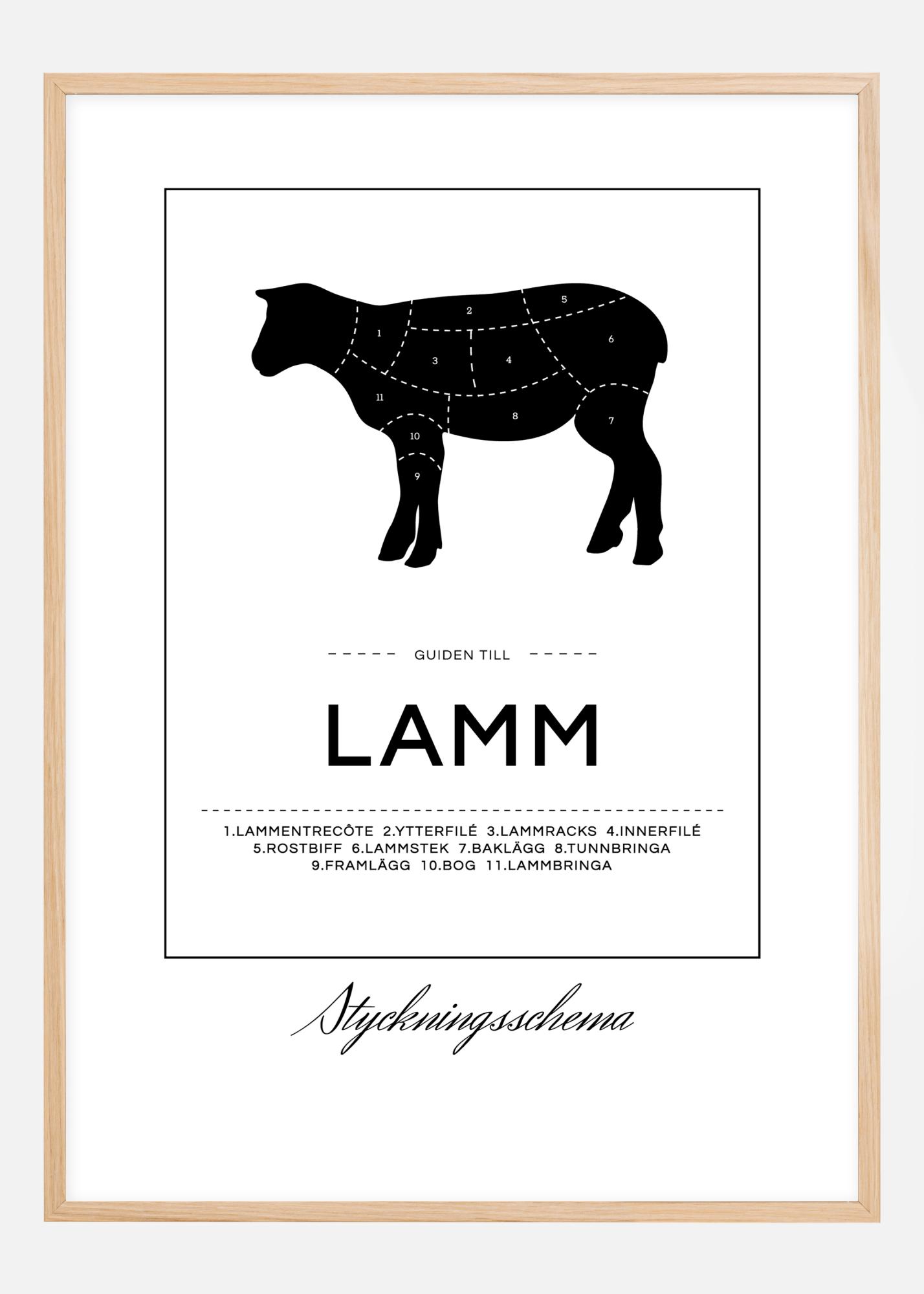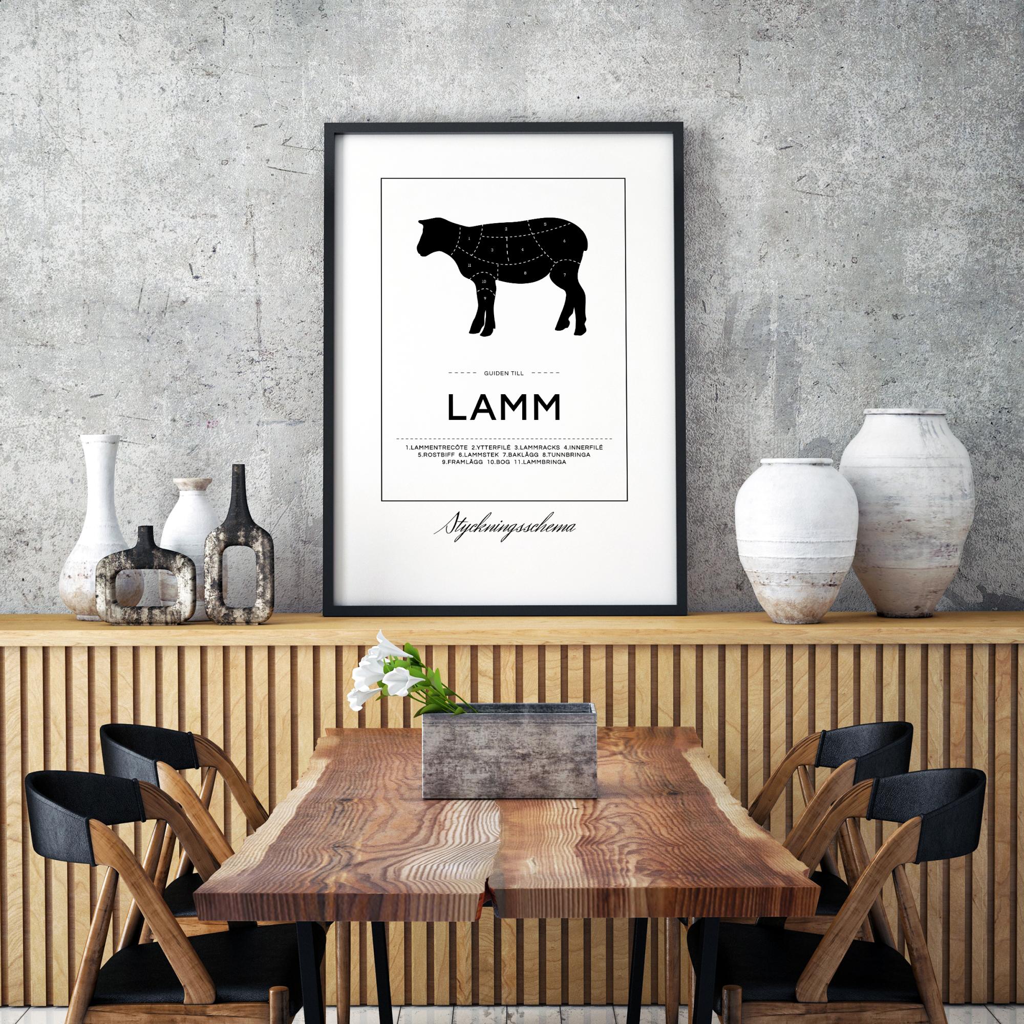 Lär dig vart du hittar alla delikatesser från lamm med denna tjusiga poster på väggen. Postern föreställer ett svart lamm som är uppdelat i markeringar som visar vart till exempel ytterfilé, lammracks och bog tas ifrån. Som komplement till bilden står texten "Guiden till lamm" tillsammans med en prydlig nummerlista över de olika delarna. Runt texten och bilden löper en tunn rektangel och under rektangeln finns ett tryck med texten "Styckningsschema".