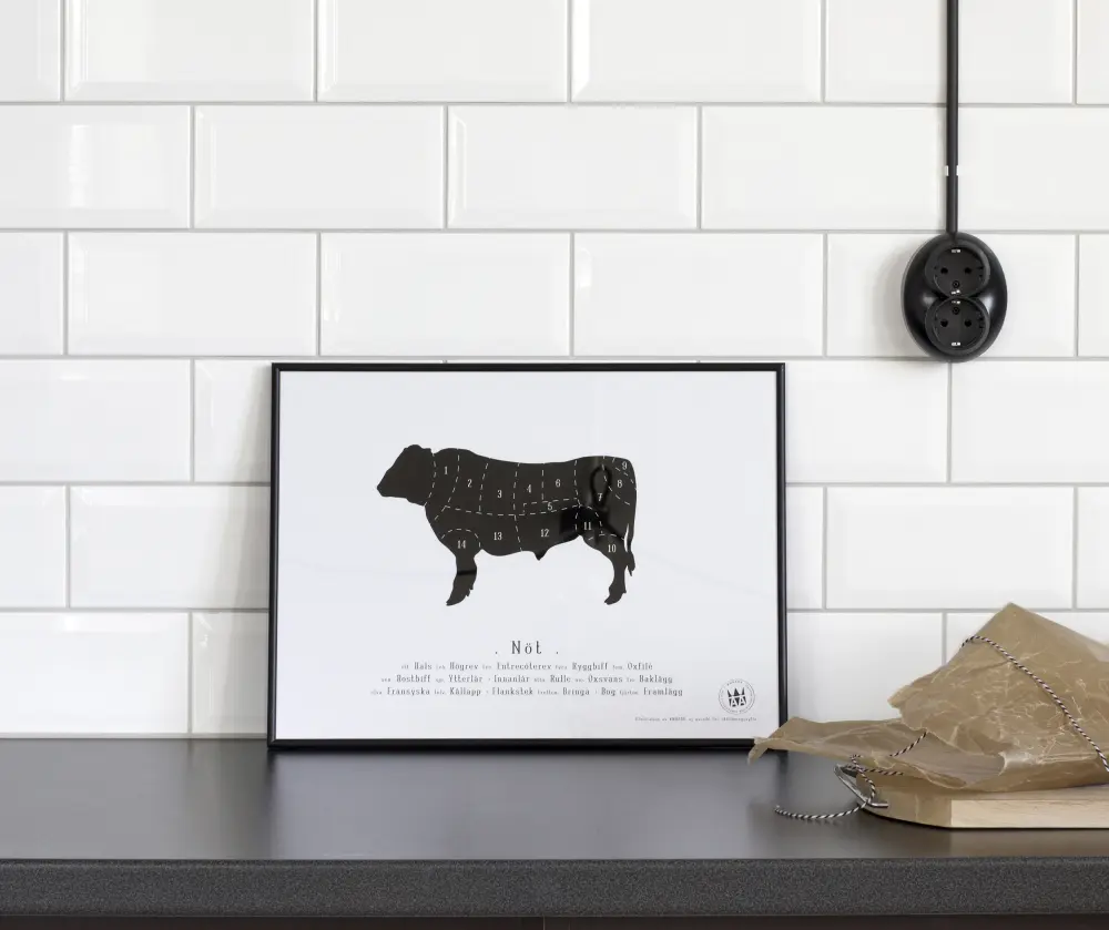 En poster föreställande ett nötkreatur och dess styckningsschema. Djuret är i svart med vita siffror som markerar var på djuret man får exempelvis högrev, entrecôte, ryggbiff, oxfilé, framlägg, ytterlår, fransyska, rostbiff och flankstek. Ett motiv som passar perfekt i köket hos den entusiastiske kocken! Passande denna poster med styckningsschema nöt är en tunn svart ram. I vårt sortiment finns även de matchande affischerna med styckningsschema för lamm och gris - kombinera gärna dessa för en fin helhet!