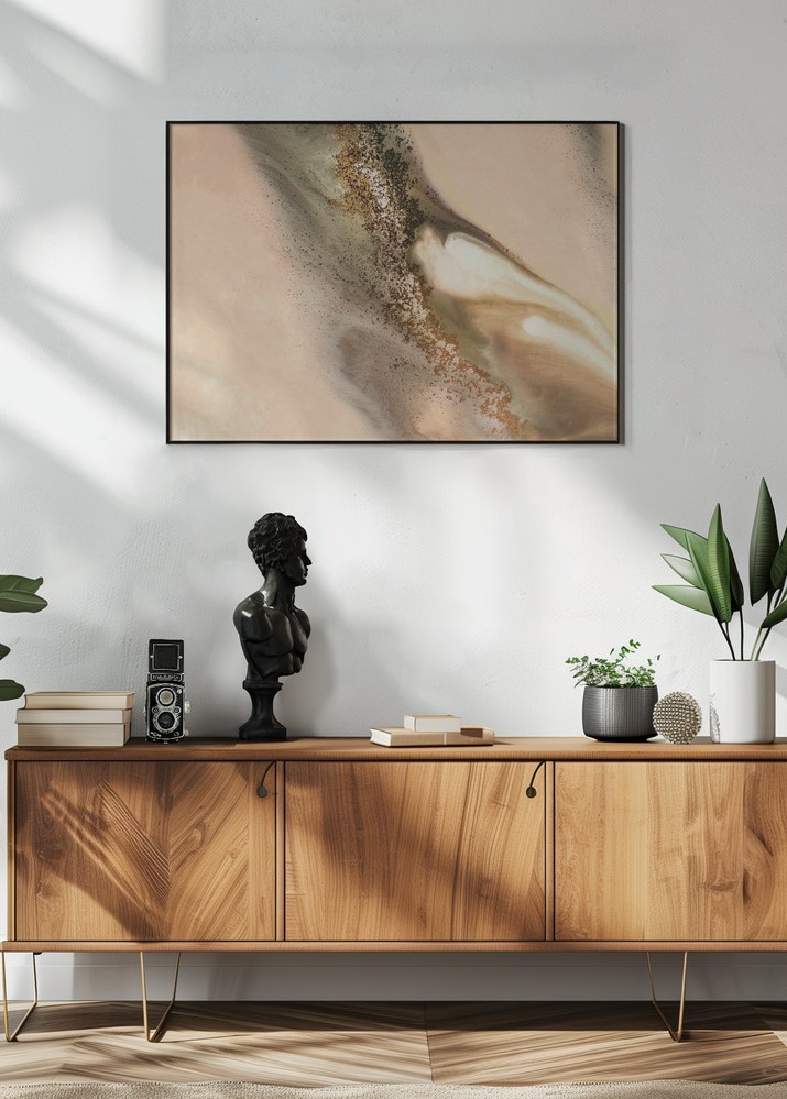 Denna eleganta poster fångar ögat med sina jordnära och mjuka toner. Motivet domineras av harmoniska nyanser av beige, vilket skapar en lugn och inbjudande atmosfär. Det skimrande inslaget i form av brons och gyllene detaljer tillför en dimension av lyx och glans, vilket gör att denna print verkligen står ut och ger stil till vilket rum som helst.