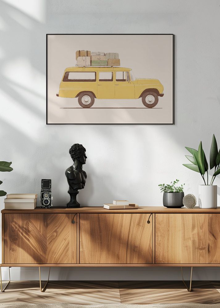 Denna charmiga poster visar en vintage bil i en härlig gul färg, laddad med retro bagage på taket. Det är ett underbart motiv för alla som älskar klassisk bilstil och nostalgi. Med sina mjuka linjer och tidlösa design, fångar denna affisch en känsla av äventyr och reslust, perfekt för att ge ditt hem en retro-känsla.