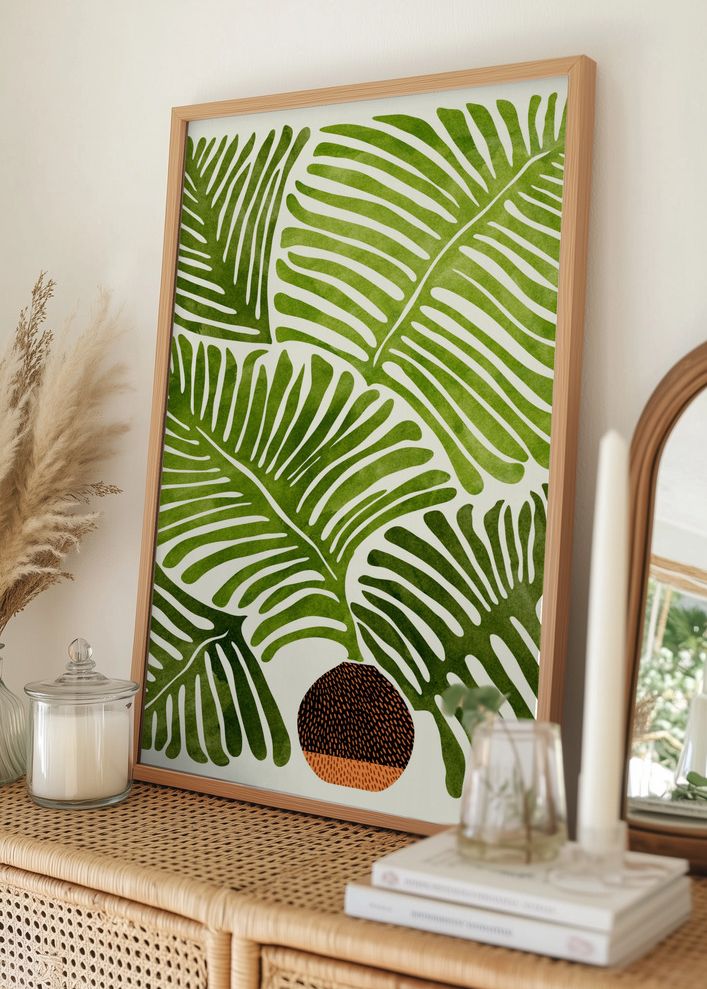 Denna affisch fångar naturens skönhet med sina livfulla gröna blad som skapar en känsla av djungel och tropisk frodighet. De grönskande löven är arrangerade i ett harmoniskt mönster som ger rummet en fräsch och livlig känsla. Denna poster passar perfekt för den som vill tillsätta en touch av naturen i sin inredning.