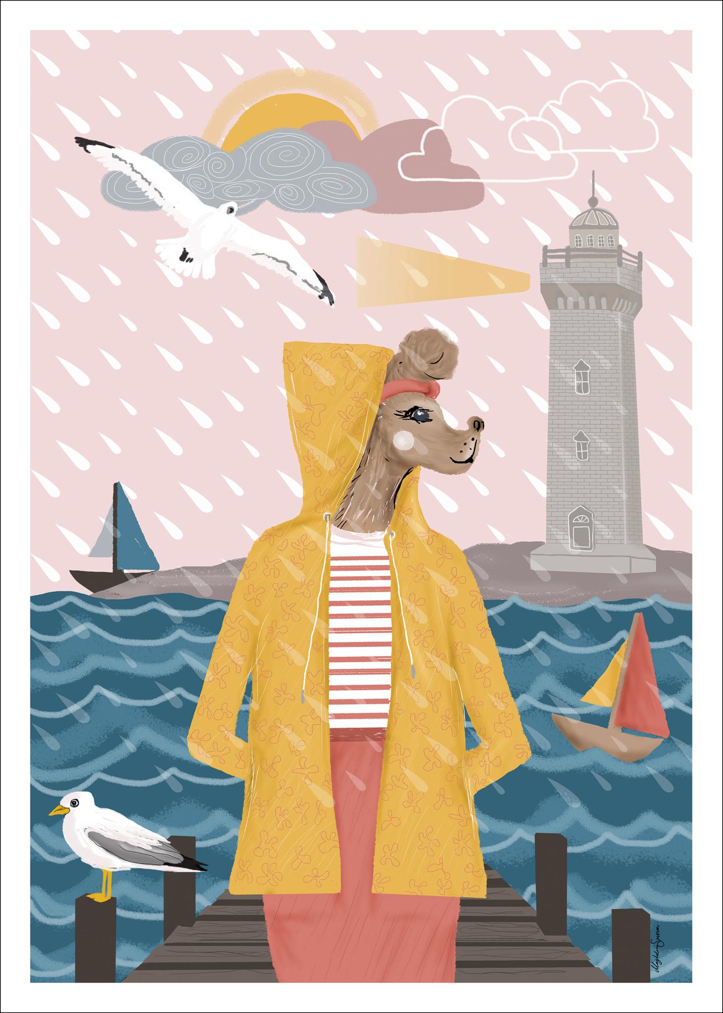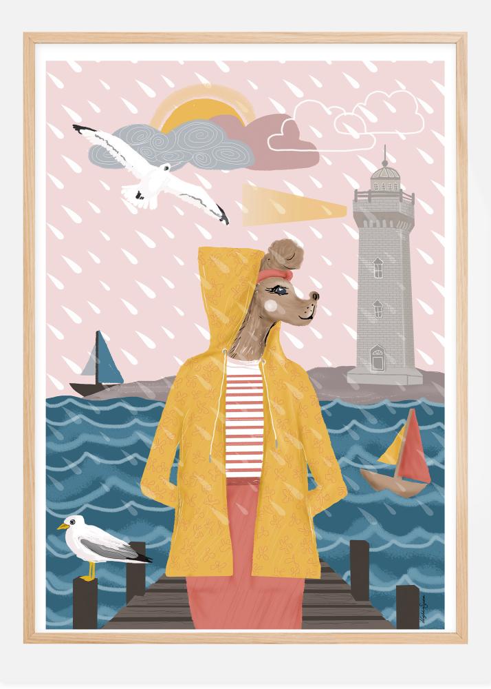 En poster i utklippsstil med en söt pudel klädd i en gul regnjacka i regnet. Hon står på en pir framför små hackande blå vågor. En fyr ligger bakom, två båtar flyter förbi och en mås flyger över. Solen tittar precis fram genom molnen och är redo att torka upp allting i denna roliga bild i stil med en sagobok.