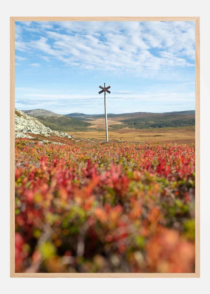 Denna stämningsfulla poster visar ett vidsträckt fjällandskap med ett ensamt träkors som blickfång mitt i naturen. Motivet fångar känslan av lugn, frihet och nordisk vildmark, där blicken leds över öppna vidder och mjukt böljande kullar. En perfekt affisch för dig som älskar naturmotiv, fjäll, vandring och skandinavisk estetik, och som vill skapa en harmonisk och jordnära känsla i hemmet.