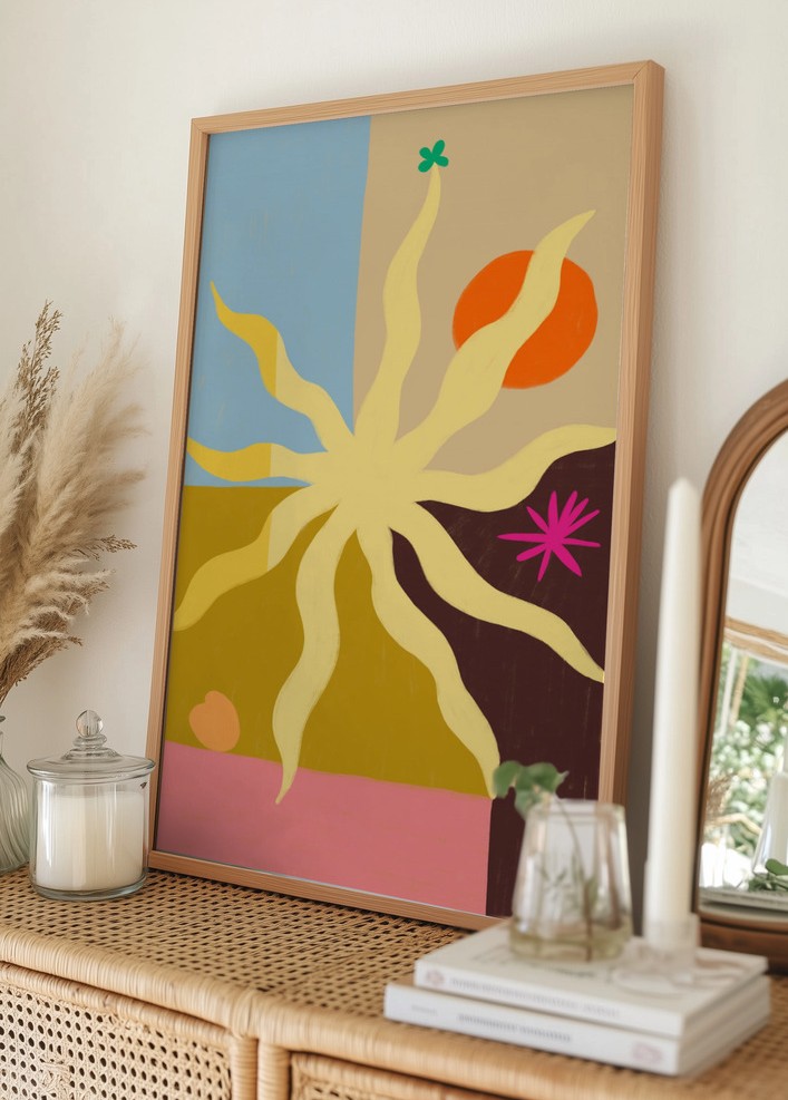 Denna färgglada poster fångar uppmärksamheten med sitt lekfulla och konstnärliga motiv. Centralt i bilden finns en strålande gul sol med böljande strålar, vilket ger en känsla av liv och rörelse. Solen omges av en palett av komplementerande färger som ljusblått, beige, och en djup brun som utgör bakgrunden. Denna affisch är perfekt för den som vill ge liv och färg till sitt hem eller kontor, och kan enkelt bli en samtalspunkt på väggen.