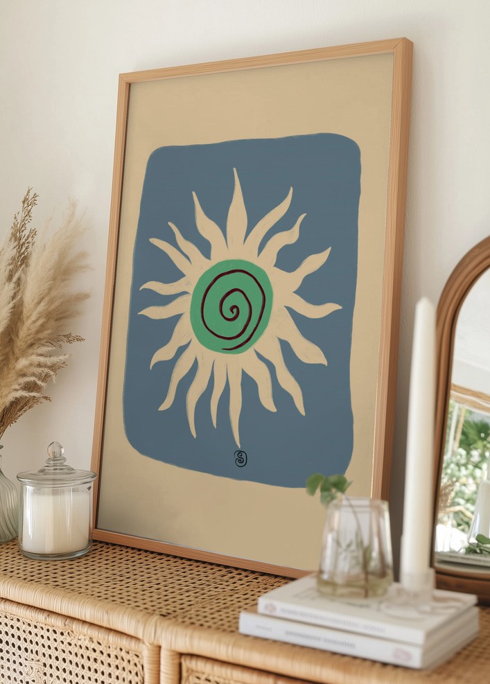 Färgpaletten i denna affisch är noggrant avvägd med en dämpad blå bakgrund, en beige ram runt solmotivet, och en levande grön och röd spiral i mitten. De harmoniska färgvalen gör denna poster lätt att kombinera med andra inredningsdetaljer och konstarter. Låt detta iögonfallande print bli en central del av ditt hem eller kontor.