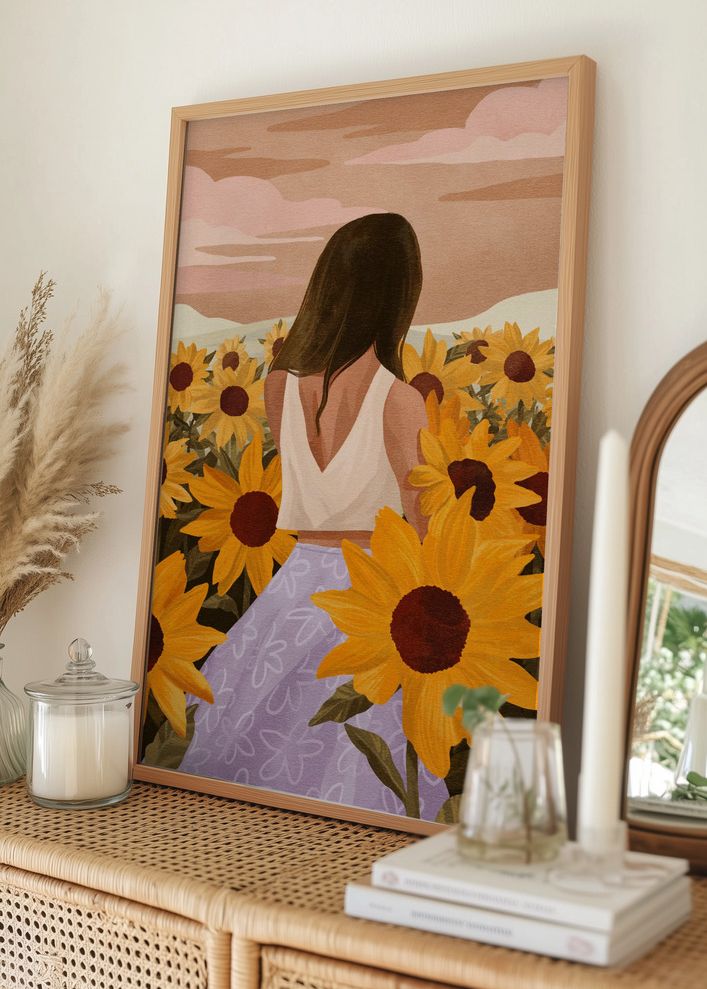 Denna poster fångar ett stämningsfullt och drömskt motiv av en person som står bland ett fält av strålande solrosor. Solrosorna, med sina gyllengula kronblad och mörkröda centrum, skapar en varm och välkomnande atmosfär. Personen i bilden står med ryggen mot betraktaren, klädd i ett plagg med en vit övre del och en lila kjol som har ett subtilt blommönster. De mjuka pastellfärgerna i himlen, med rosa och beige nyanser, bidrar till den lugna och harmoniska stämningen i denna unika print.