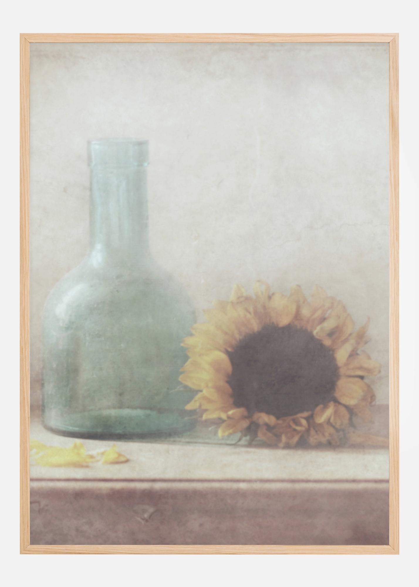 En klassisk poster med en glasflaska och huvudet på en solros. Höljd i en mjuk oskärpa är den här stillbilden mjuk och fridfull. De gula kronbladen böjer sig mjukt när blomhuvudet vilar på hyllan. Häng det här mjuka pastelltrycket på en neutral vägg för en lugnande effekt.