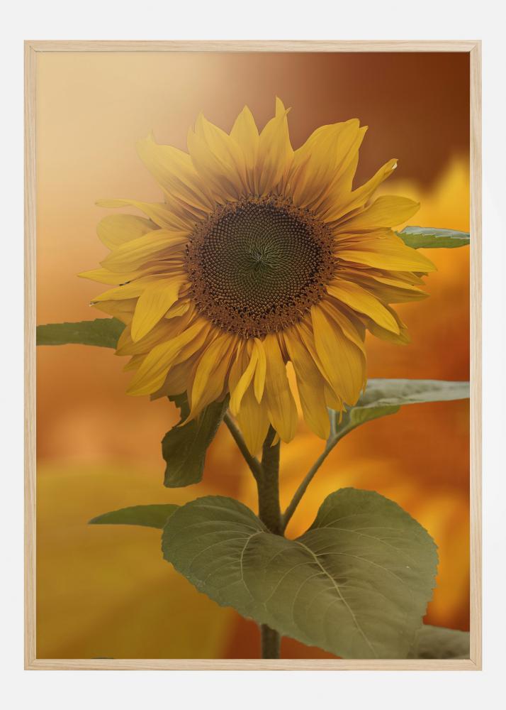 En klassisk poster med en glasflaska och huvudet på en solros. Höljd i en mjuk oskärpa är den här stillbilden mjuk och fridfull. De gula kronbladen böjer sig mjukt när blomhuvudet vilar på hyllan. Häng det här mjuka pastelltrycket på en neutral vägg för en lugnande effekt.
