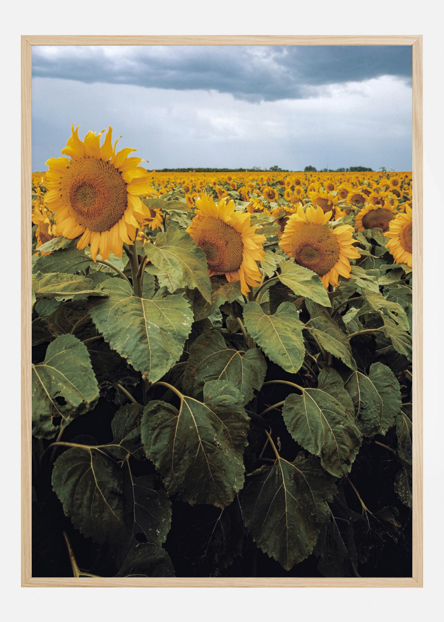 En bländande poster med ett stort fält med solrosor. Bilden är fylld av blommornas långa gröna stjälkar och blad. Överst svävar ett hav av ljusgula solrosor som sträcker sig mot fjärran och den blå himlen. Känn dig upplyft med det här glada trycket.