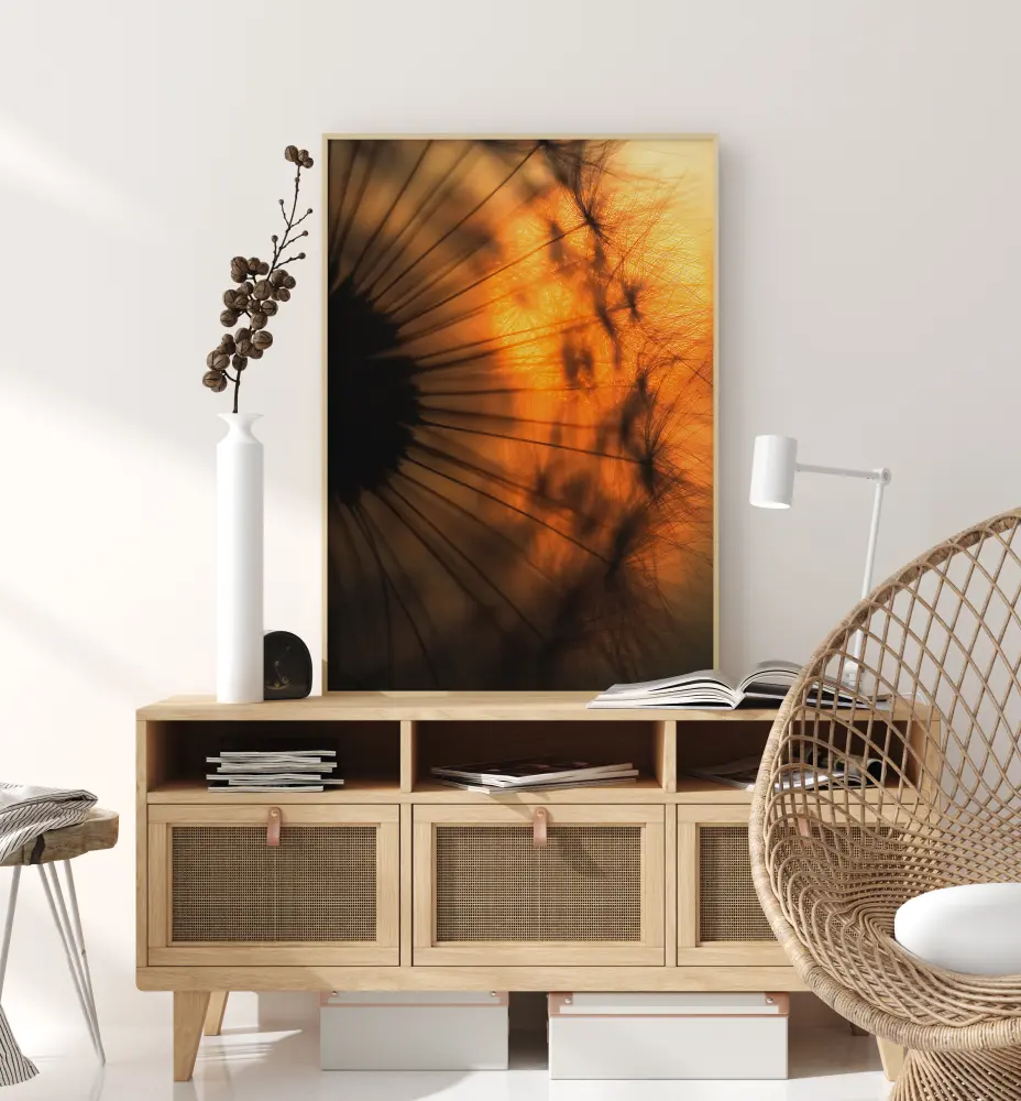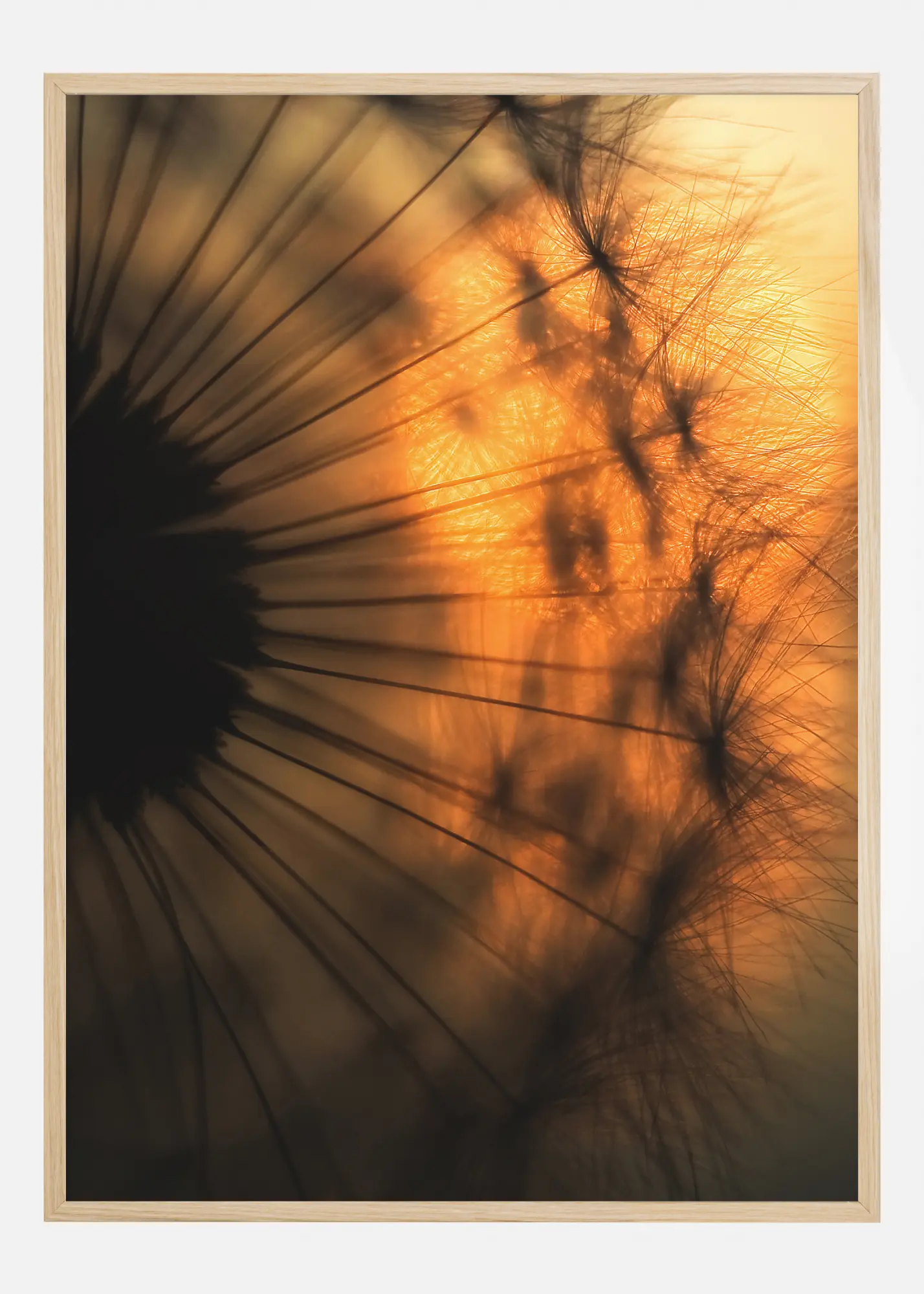En närbildsposter av en maskrosklocka med en ljusröd solnedgång som flödar igenom. Solens ljust orangea toner dämpas av det stora maskroshuvudet, som speglar solens massiva for, vilken precis syns genom fröna i det här episka trycket.