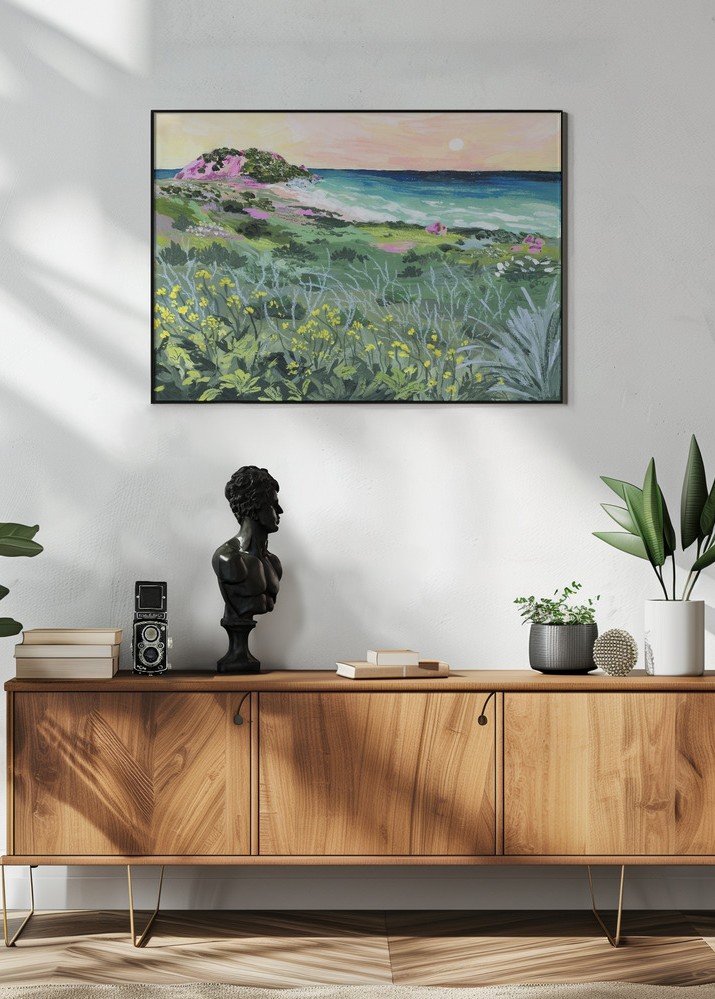 Den här postern fångar en idyllisk vy över en somrig kust. Det färgstarka landskapet med sina livfulla gröna nyanser ger en känsla av friskhet och naturens skönhet. Blommor i gult och vita toner växer vilt i förgrunden, medan den mjuka sandstranden och det turkosa havet sträcker sig ut mot horisonten. Solen sänker sig på himlen, målad i mjuka rosa och aprikosa nyanser, vilket skapar en harmonisk och avkopplande atmosfär.