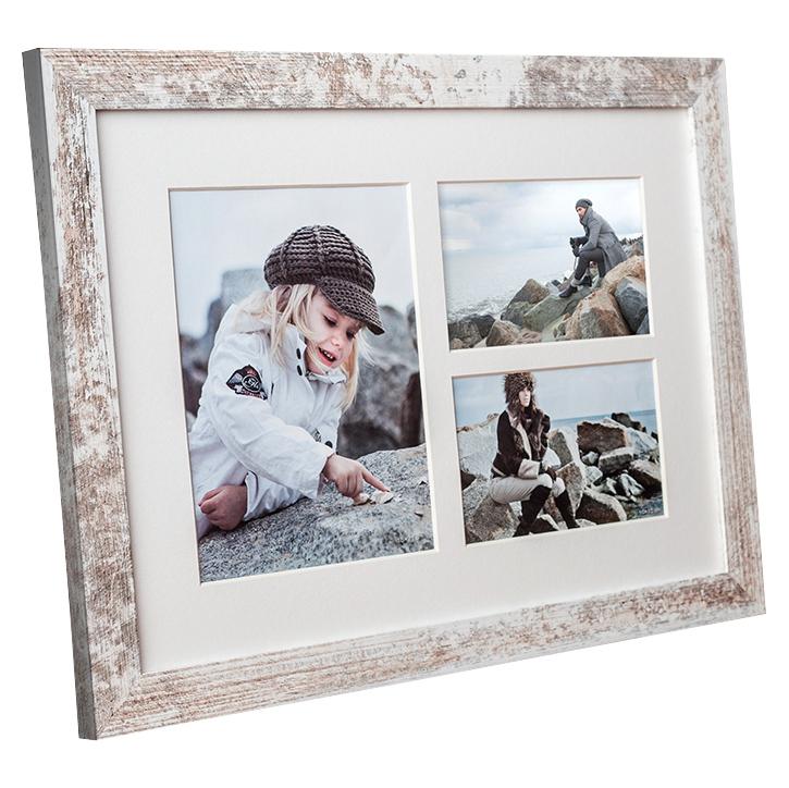 Snygg vintageram med en bred ramprofil med en sliten look i vitt och trä. Ger en extra dimension till dina bilder och passar perfekt när du vill ha en genuin vintagekänsla. Collageramen har plats för 3 bilder i varierande storlekar.
