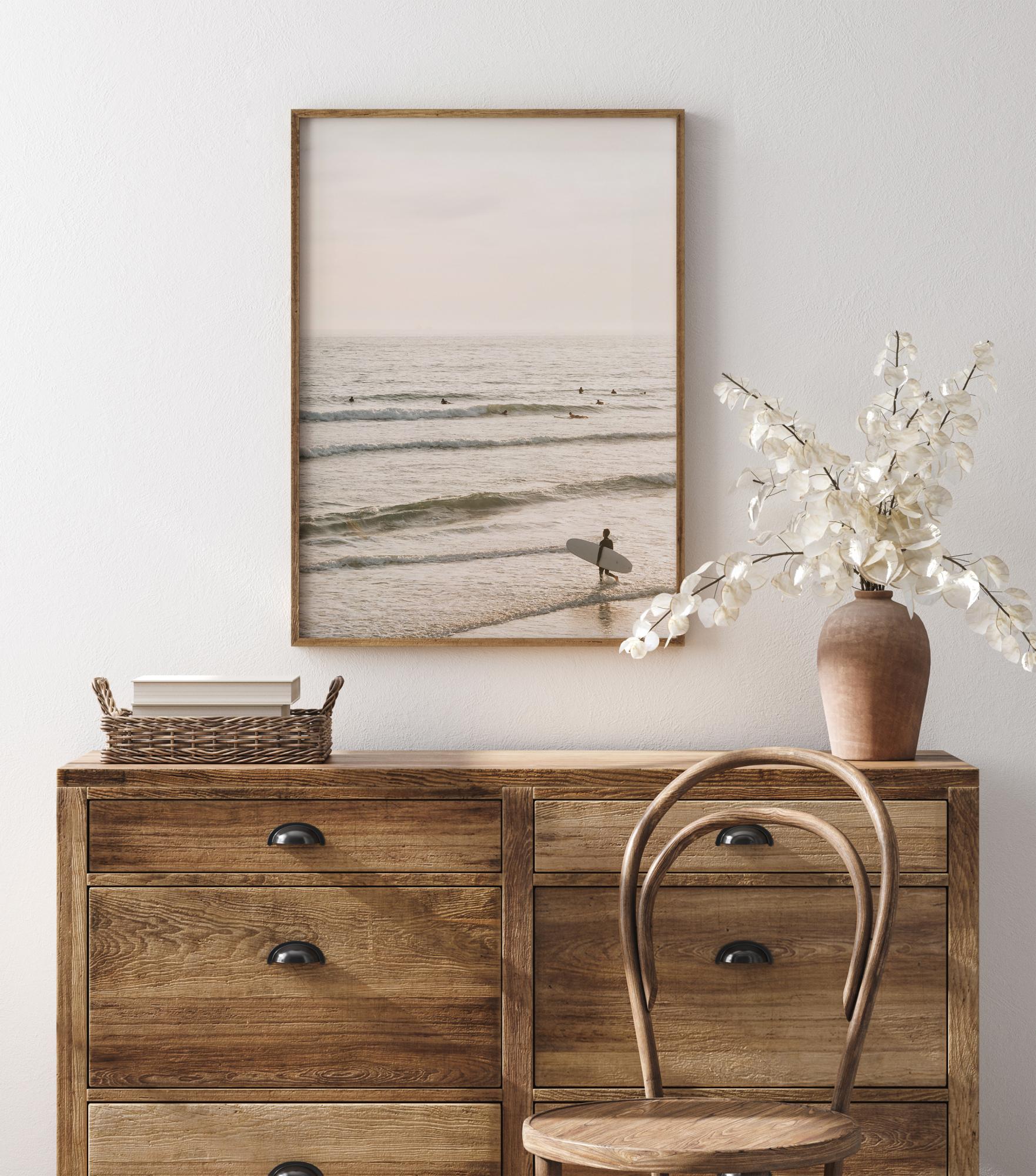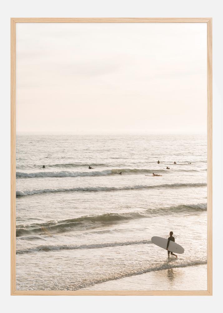 En poster med ett vidsträckt hav fyllt av surfare som väntar på nästa stora våg. Små huvuden guppar långt ut i havet och en sista surfare promenerar in bland vågorna med sin bräda. Havet är lugnt i det mjuka morgonljuset och det finns en känsla av förväntan i luften.