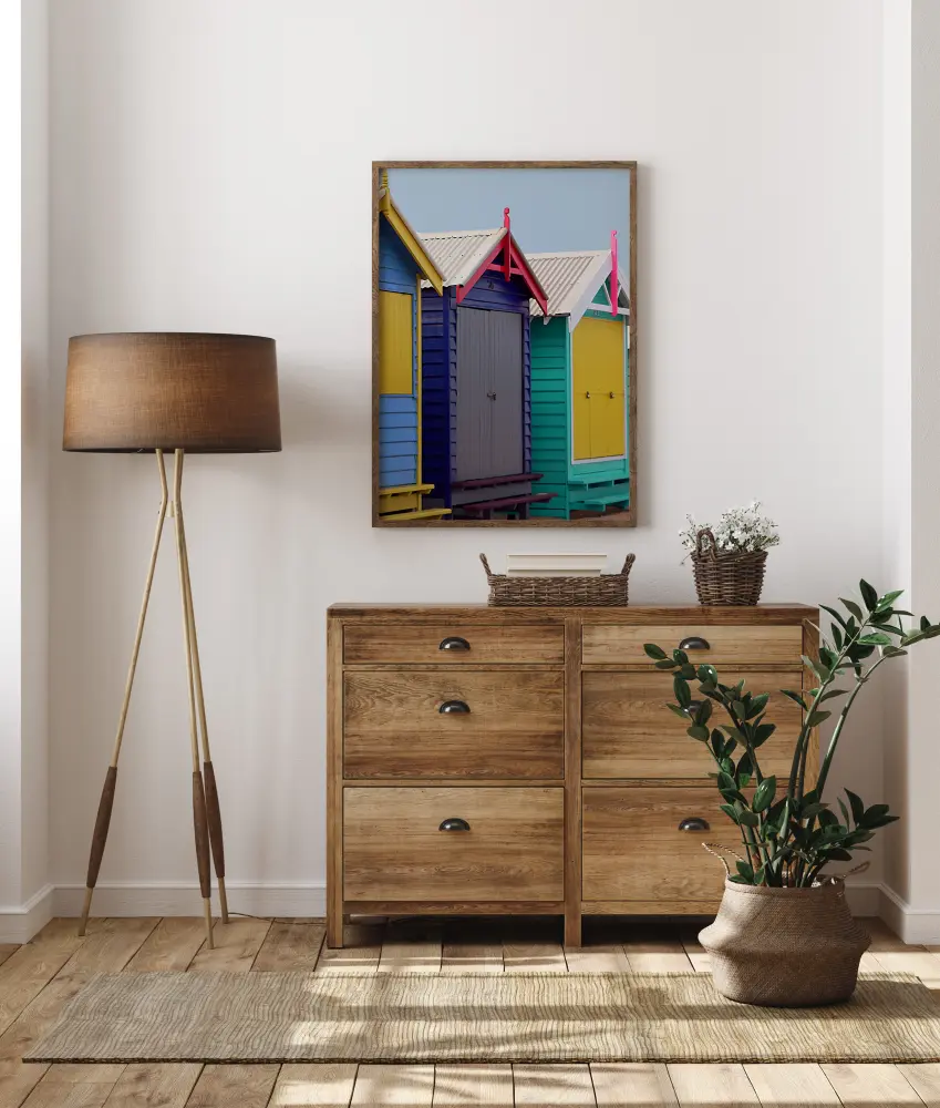 En ljus poster med färgglada strandhytter. Varje stuga är målad i flera livliga färger, som gult, blått, rosa och turkost. Få sommarens strandkänsla när du hänger den här på en neutral vägg och ger färg åt ditt hem.