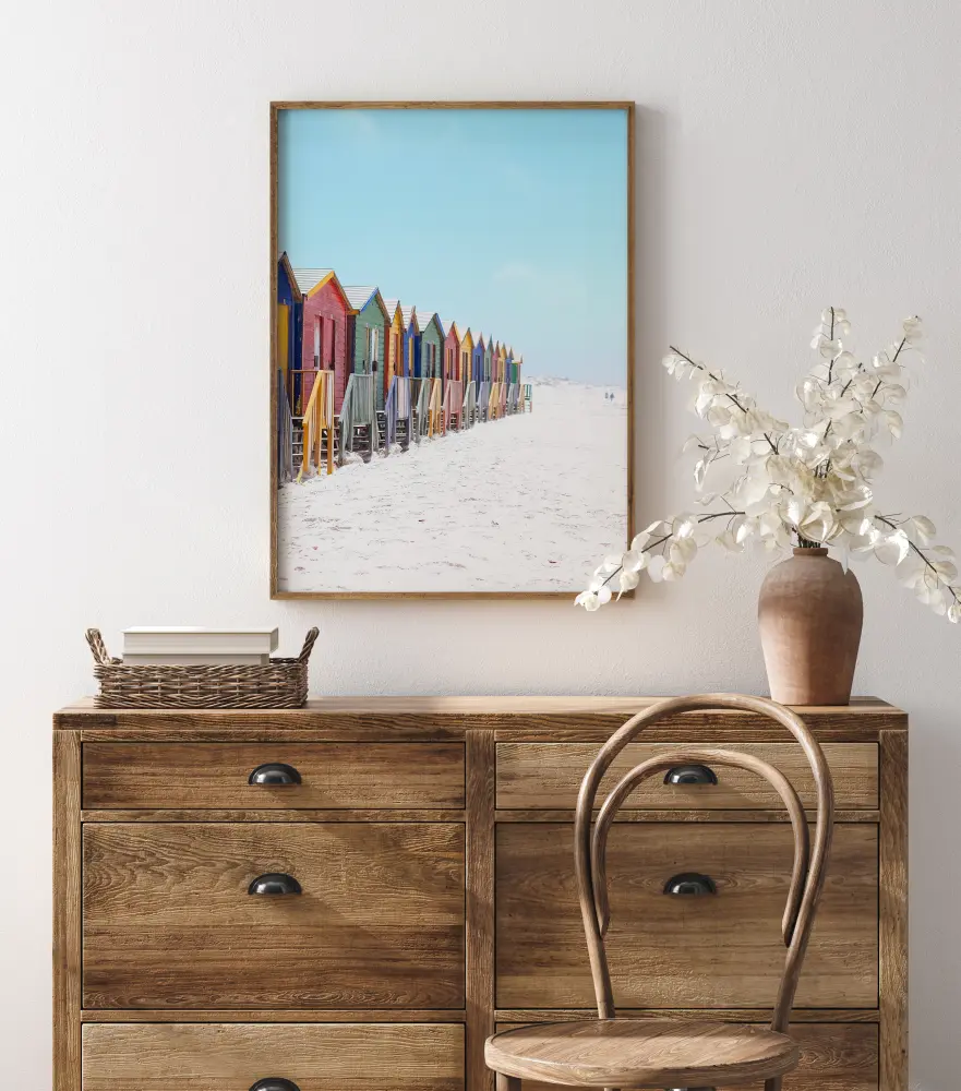 En strandposter med en rad strandhytter längs en vit strand med en mjukblå himmel ovanför. Varje hydda har sin egen färg, bland annat rött, grönt, gult och blått. Raden av flerfärgade hyddor drar blicken djupt in i bilden och den varma sommarkänslan som den disiga himlen ger.