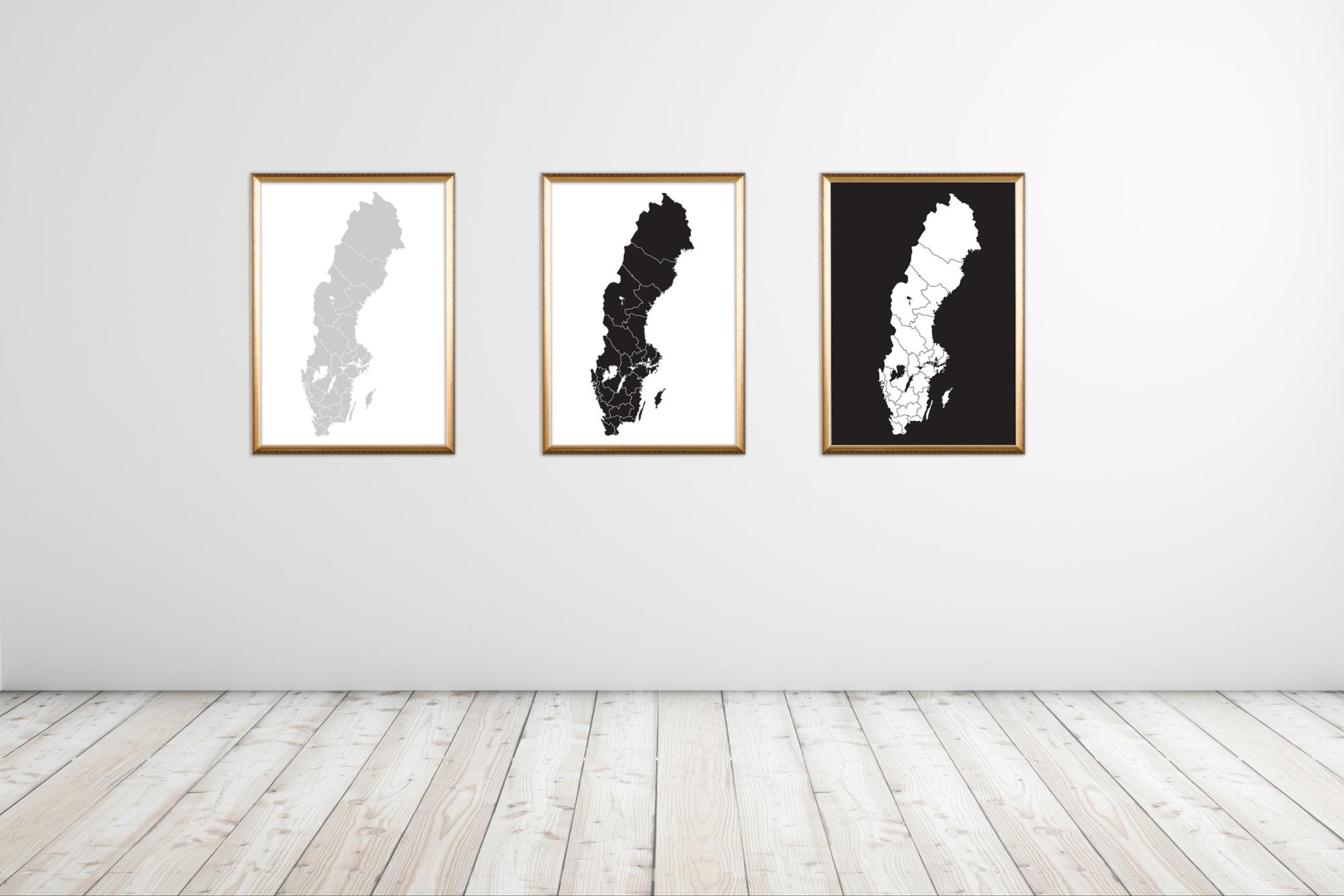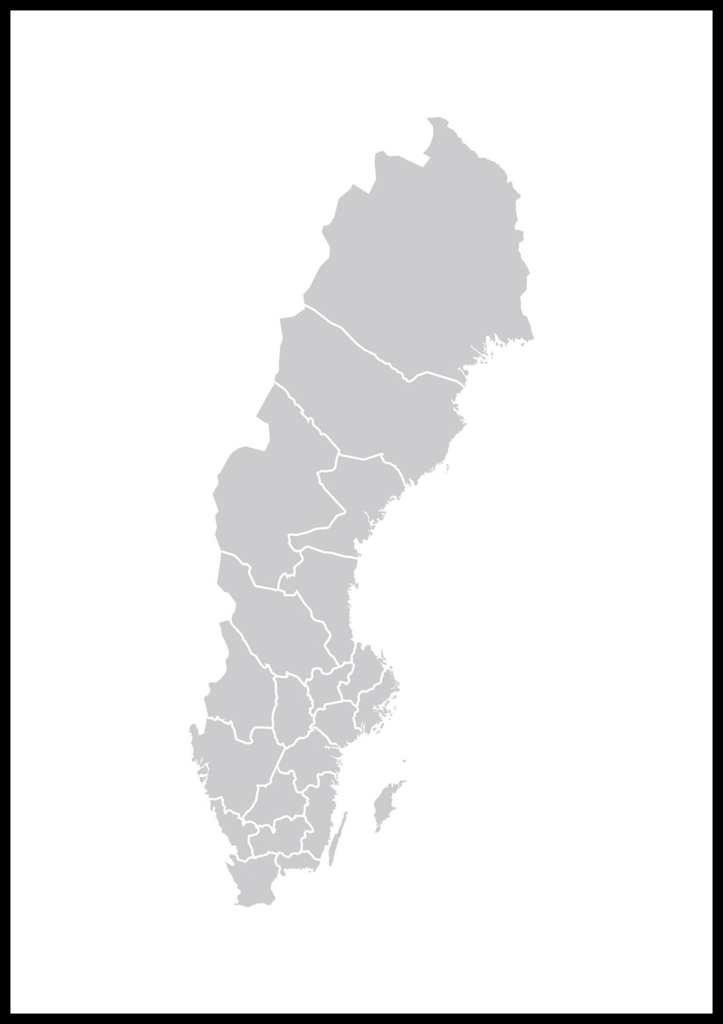 Poster med en Sverigekarta i grått på vit bakgrund, med alla landets län är utmärkta. Ett motiv som passar bra in i alla typer av miljöer, det är en lika fin dekoration på hemmets väggar som i väntrummet hos tandläkaren. Bilden blir fin att rama in med en tavelram i vitt eller svart och kan kombinera med andra illustrationer och grafiska tavlor. Postern är även en tacksam present att ge bort till den som behöver nått stilrent på väggen.