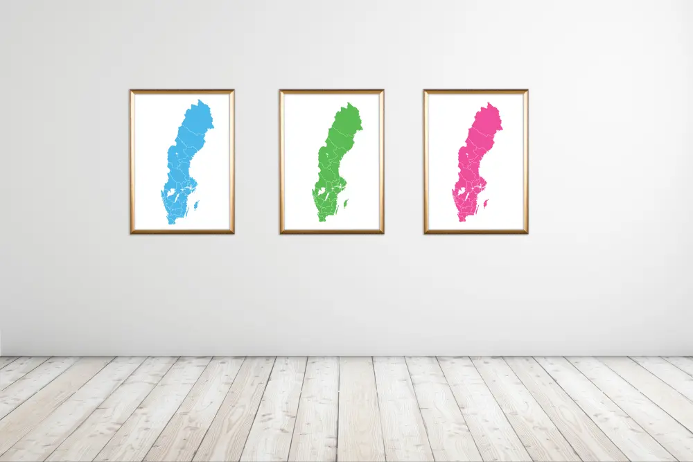 Snygg affisch med en Sverigekarta i en härligt rosa kulör med vit bakgrund och alla länen markerade med vitt. Ett riktigt läckert grafiskt tryck som passar perfekt in i den glamorösa inredningen, kanske med guldfärgade häftstift som markerar viktiga platser. Postern passar lika bra att komplettera med en svart ram för en rockig look som med en guldfärgad för en lyxig känsla i rummet.