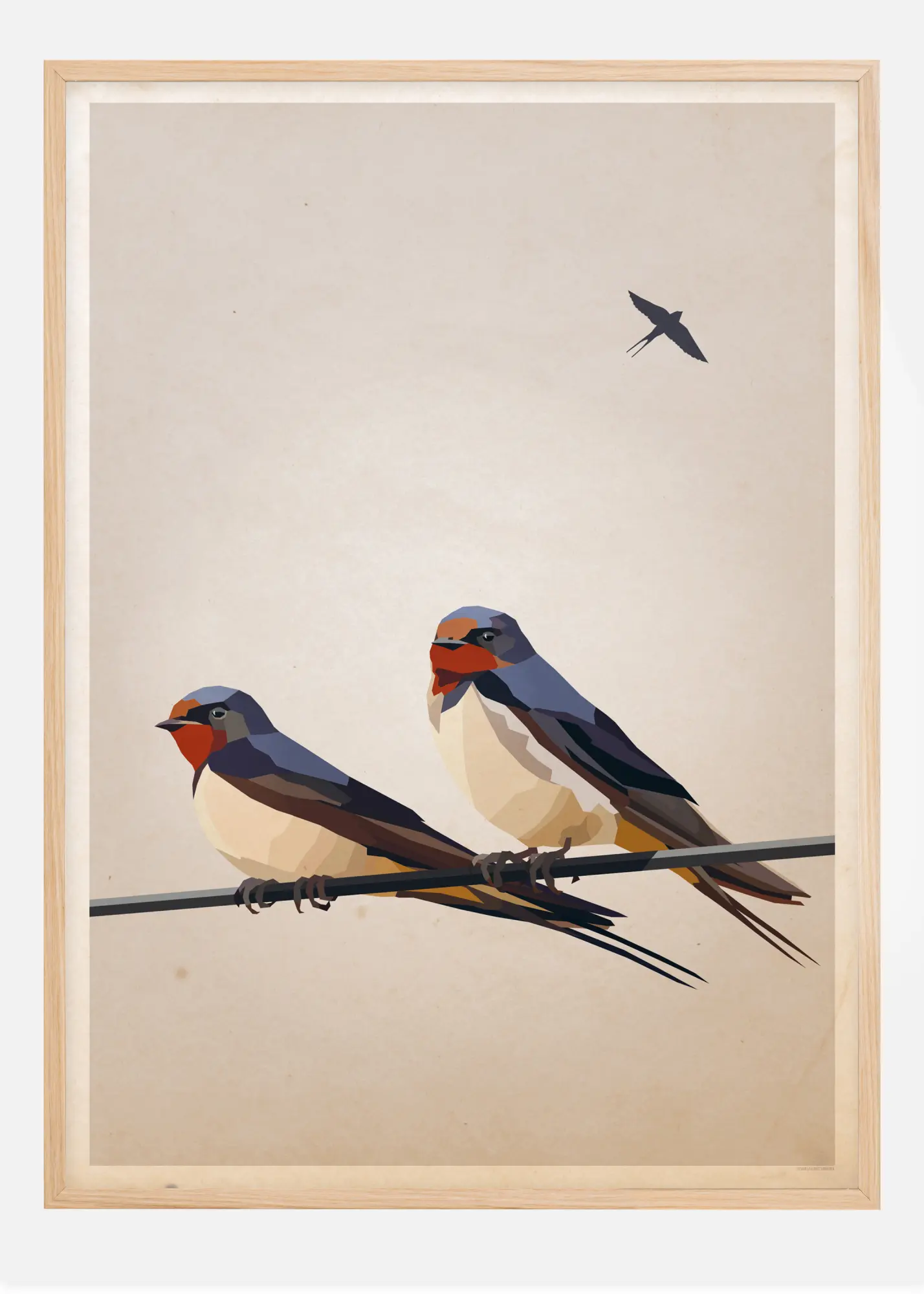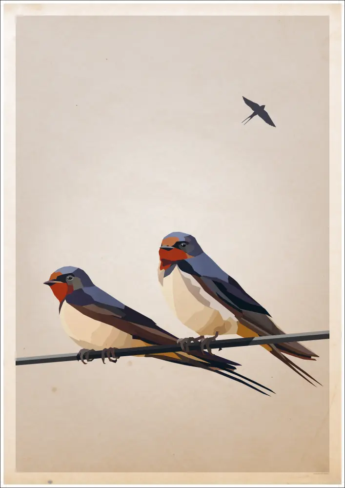 En djurposter med tre svalor som är tecknade med färgfält. Två rödkindade fåglar sitter på en enda tråd som är spänd över bildens nederdel. En tredje fågel flyger iväg mot fjärran. Svalornas ljusa blå och röda färger kommer att se bra ut på en enkel neutral vägg hemma.