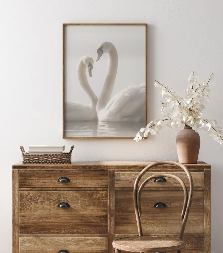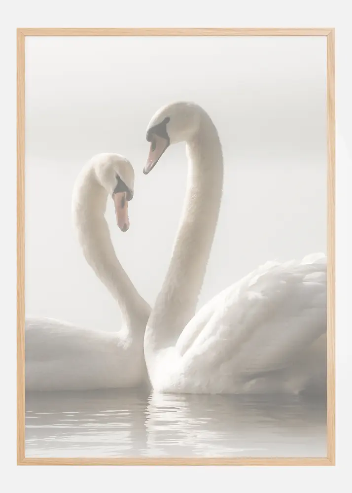 En romantisk poster med två svanar som simmar tillsammans. Den mjuka belysningen ger ett harmoniskt lugn till den här bilden där svanarna glider mot varandra. Deras halsar lyfts upp och skapar en hjärtform. Känn kärleken i det här förtjusande fotot.