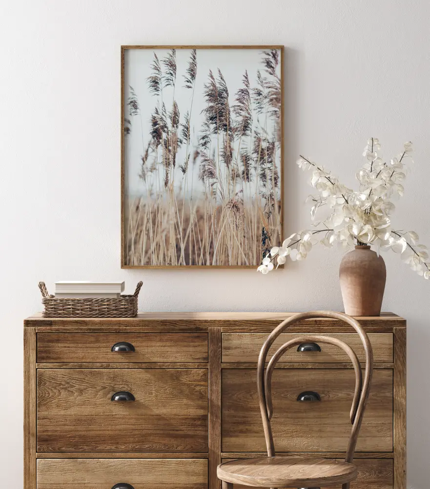 En naturposter med vajande vass mot en mjuk vit bakgrund. De gyllene vasstråna är tunna och spröda. Vissa är tydligt i fokus medan andra inte är det, vilket skapar djup i det här enkla men eleganta trycket. Häng på en cremefärgad vägg för att behålla mjukheten.