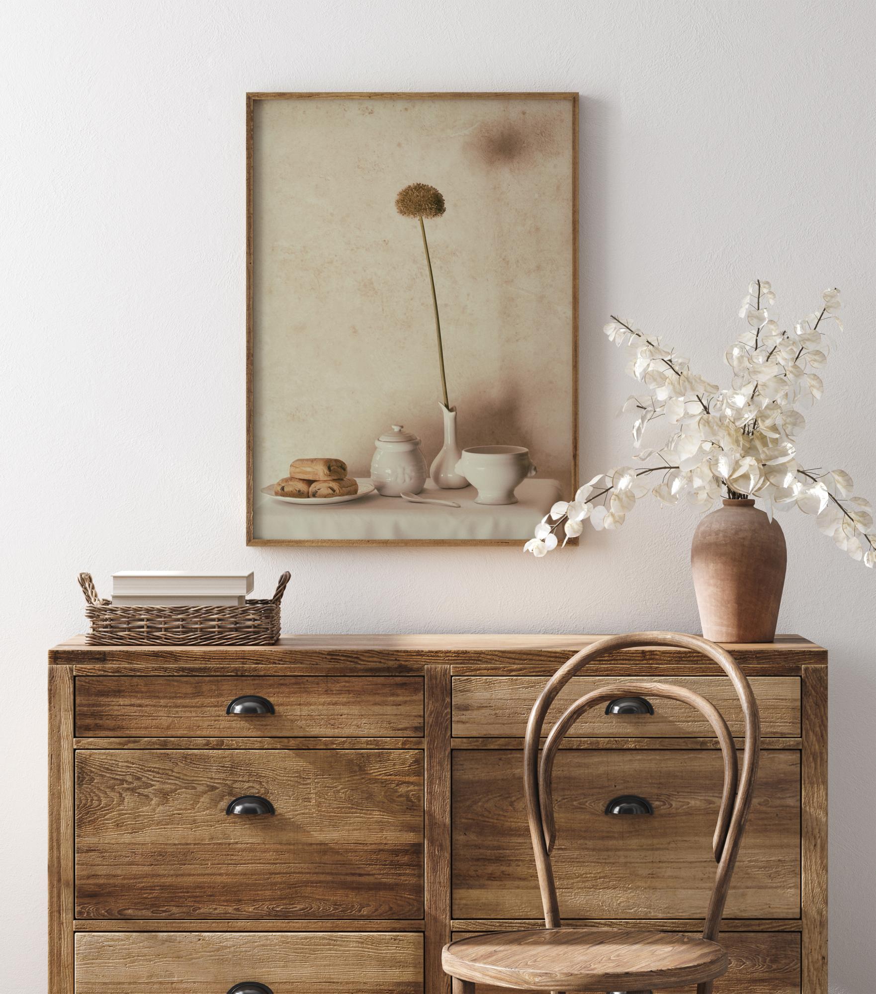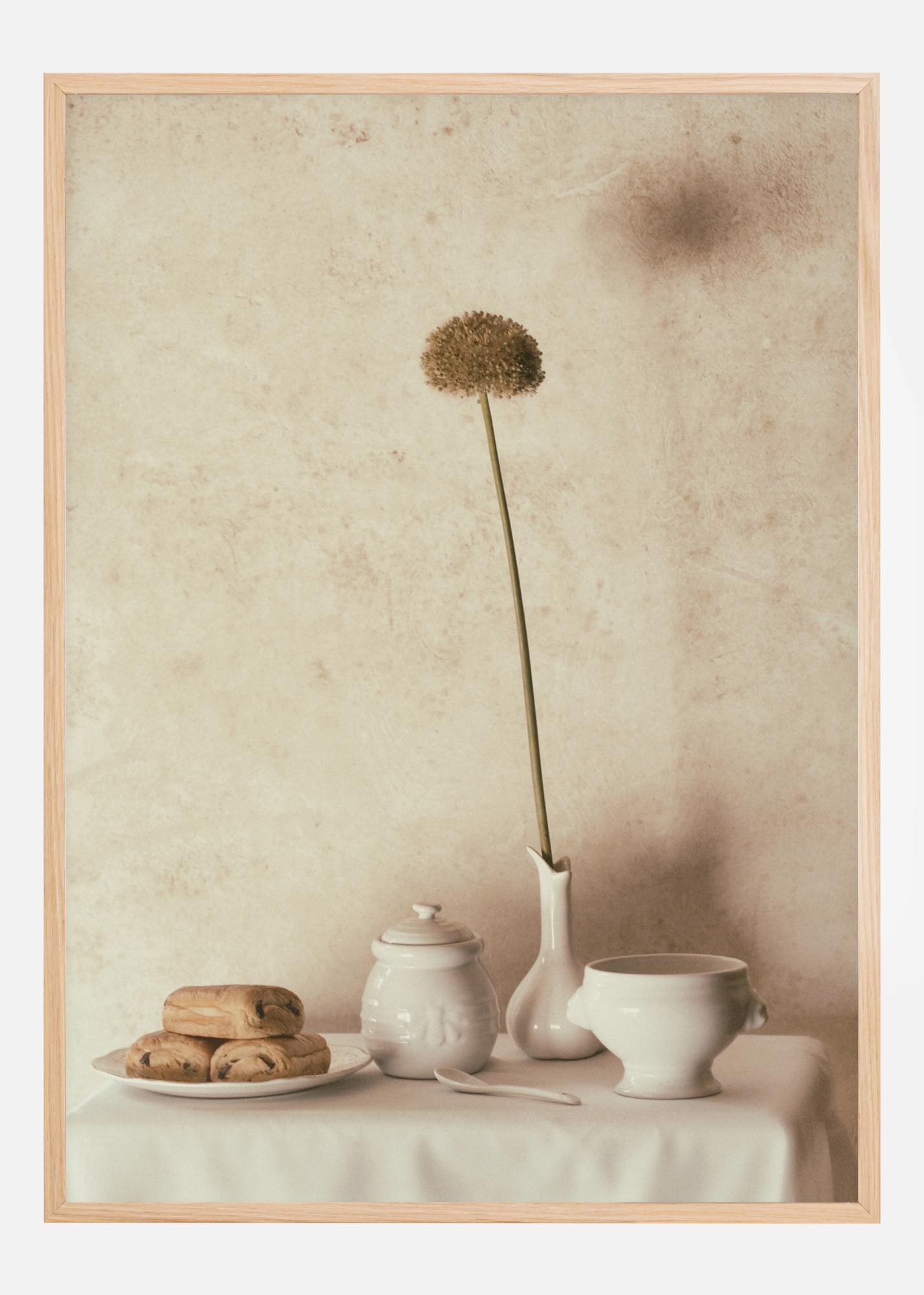En stillebenposter med pain au chocolate i en skål, en honungsburk och en vas med en enda blomma. Den här söta frukosten är placerad mot en neutral vit vägg för en enkel, men effektiv stämning. Föreställ dig att du är på kontinenten när du tar din morgonfrukost med detta i ditt kök.