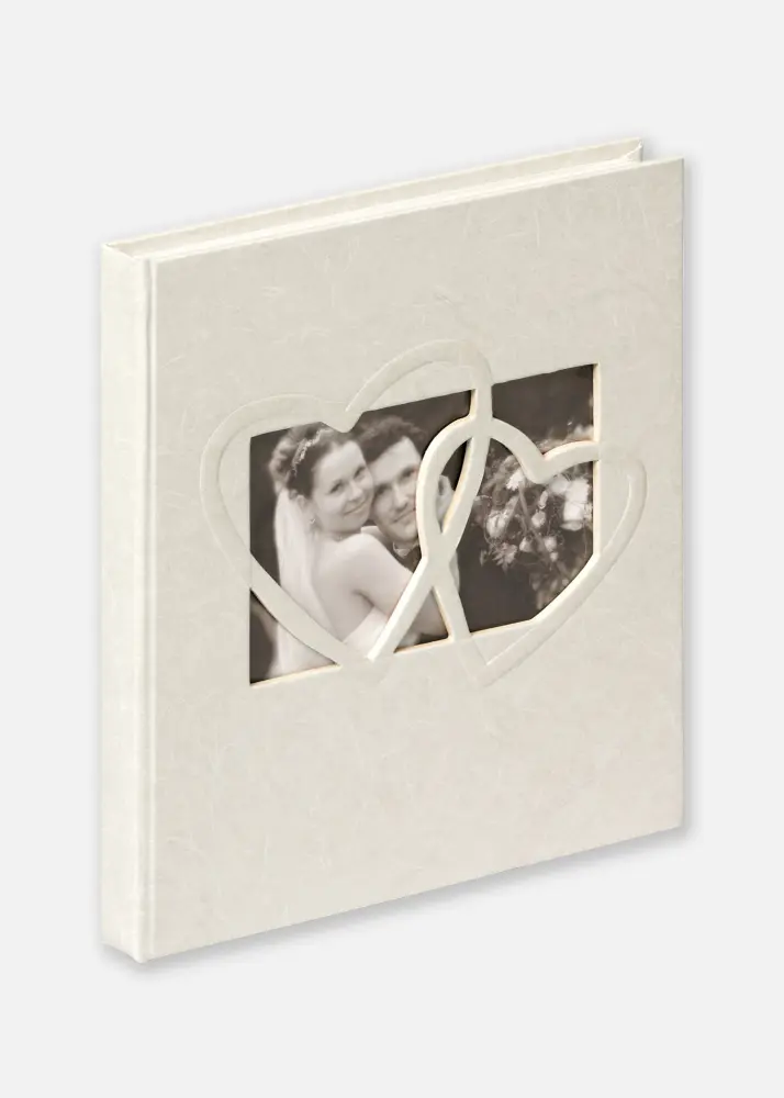Romantisk gästbok till bröllopet med vackra pärmar i linne med präglade hjärtformade mönster. På framsidan finns även plats för en egen bild.