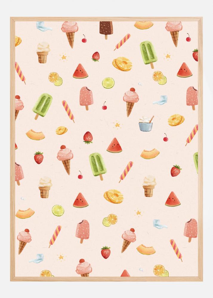 Uppfriskande och somrig, denna poster är perfekt för den som vill addera en söt och lekfull touch till sin inredning. Motivet består av en samling delikata illustrationer av sommarens favoriter; glassar i olika former och smaker, fruktbitar såsom vattenmelon, citrus och banan, samt klassiskt godis. Denna print inbjuder till glädje och passar utmärkt i kök, barnrum eller varje rum som kan dra nytta av ett stänk av färg och lekfullhet.
