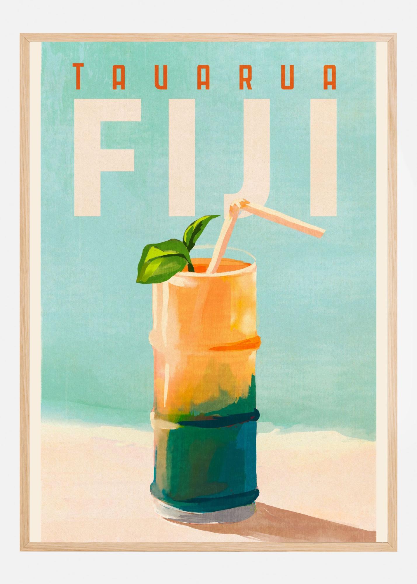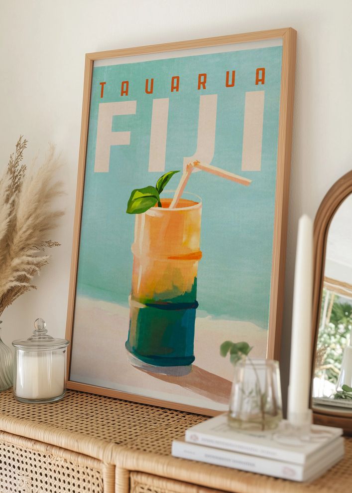 Den här trendiga postern bjuder på en smak av tropikerna med sitt uppfriskande motiv av en färgglad dryck. Kontrasten mellan de mjuka pastelltonerna i bakgrunden och de livfulla färgerna i glaset skapar en iögonfallande och stilfull print. Texten "Tavarua Fiji" ger motivet ett exotiskt och inbjudande uttryck som tar dig till soliga stränder och sommarvärme.