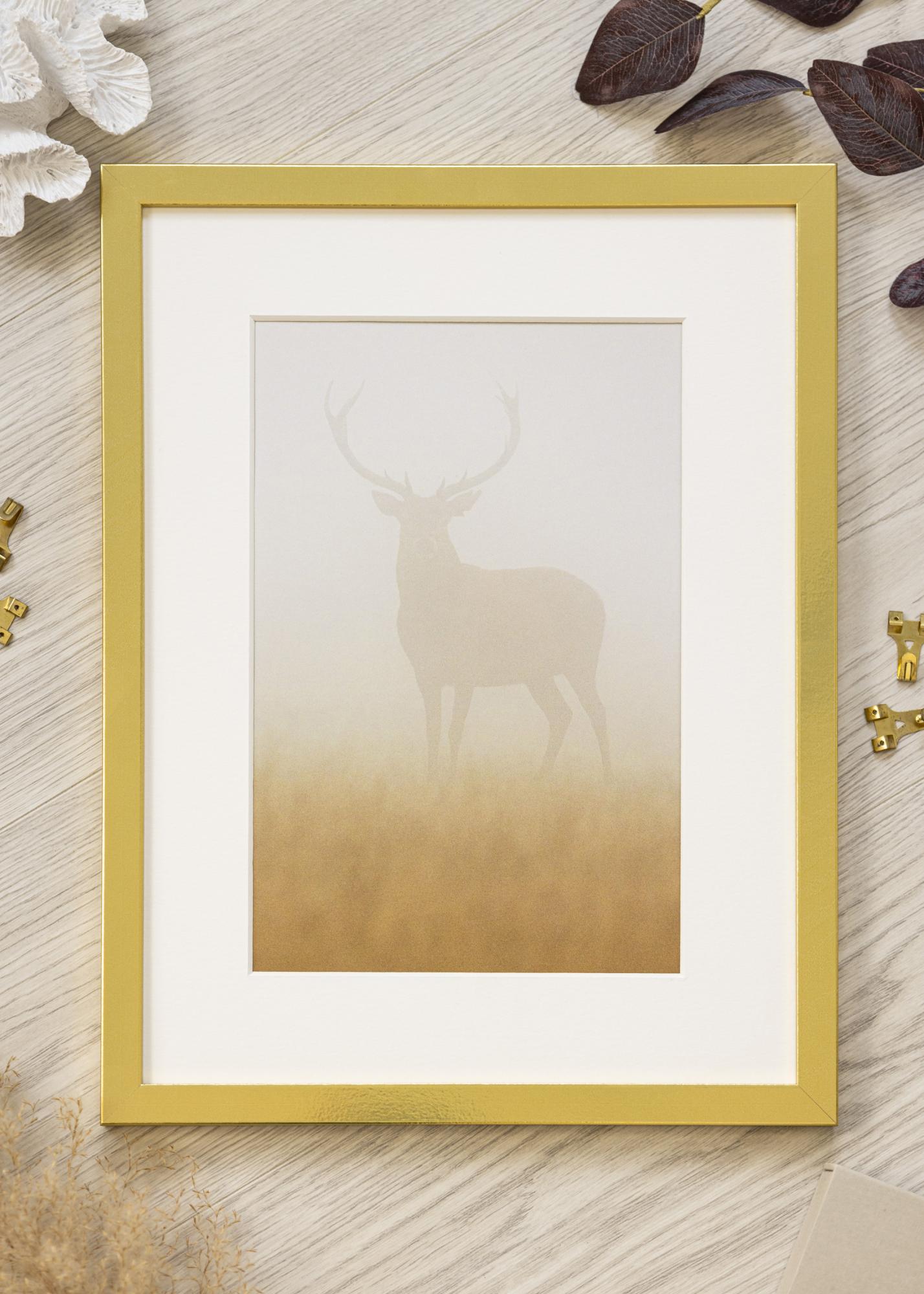 Den här fotoramen är en perfekt kombination av elegans och modern design. Med sin stilrena profil i en lyxig guldfärg ger den ett sofistikerat uttryck till vilket rum som helst. Ramen är tillverkad av trä och har en subtil glans med en lätt strukturerad finish, vilket förstärker dess exklusiva känsla. De skarpa och rena hörnen bidrar till det minimalistiska utseendet, vilket gör den till ett utmärkt val för att framhäva dina favoritmotiv.