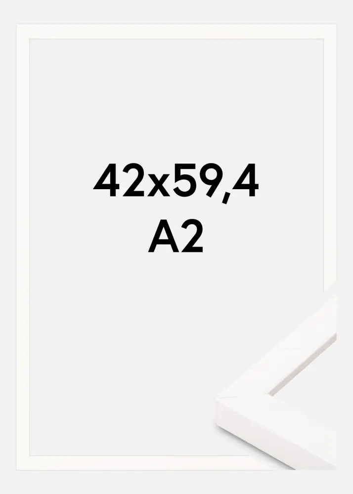 Denna stilrena fotoram i vit färg är perfekt för att framhäva dina favoritmotiv. Med en storlek på 42x59,4 cm (A2) passar den utmärkt för större bilder och affischer. Den eleganta och minimalistiska designen med en tunn, slät profil ger ett stilrent intryck som smälter in i de flesta inredningar. Ytan är matt och har en jämn finish, vilket gör att motivet verkligen kommer till sin rätt.