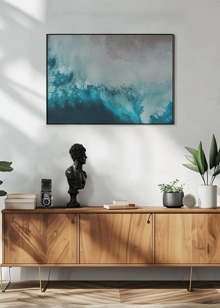 Färgpaletten i motivet består av en skarp kontrast mellan de mörkblå och turkosa nyanserna, vilket framhäver vattnets rörelse mot himlens skira beige och gråaktiga toner. Den subtila övergången mellan färgerna skapar djup och dimension, vilket gör denna affisch till ett perfekt tillskott i både moderna och klassiska interiörer. Låt denna bild inspirera och locka med sina färger och stämningar på en plats där stil och elegans möts.