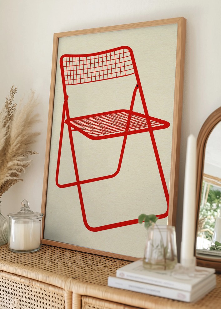 Upptäck vår moderna poster med ett stilrent motiv av en röd stol. Denna print är perfekt för dig som söker en minimalistisk och tidlös design. Motivet föreställer en enkel och elegant fällstol, vars distinkta linjer skapar en häftig kontrast mot den ljusa bakgrunden.